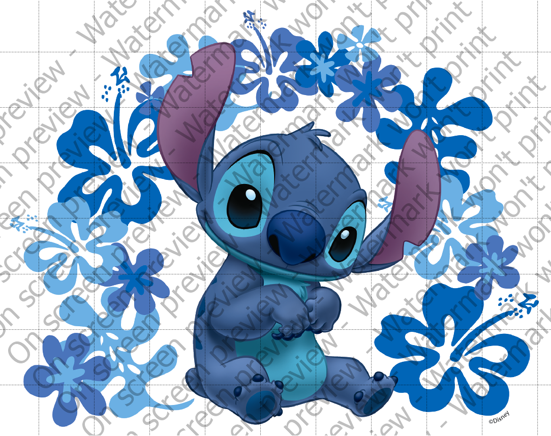 Esta imagen muestra a Stitch sentado debajo de un arco de flores tropicales azules. Completa la celebración con esta imagen de adorno de pastel comestible.