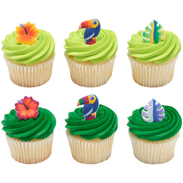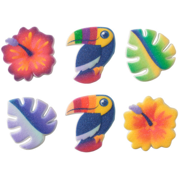 ¡Escápate a un paraíso de diversión con estas decoraciones de vibraciones tropicales! ¡Estas decoraciones convertirán cualquier dulce en un oasis tropical! Hecho de azúcar finamente granulada moldeada en formas y pintada con colorante alimentario comestible.