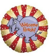 Dales una cálida bienvenida con nuestro Globo de Bienvenida. Este globo redondo de aluminio presenta un elefante gris con la frase "Welcome Back" sobre un fondo de rayas rojas y beige. Utilice este globo como centro de atención o mezcle y combine con otros para crear un ramo de globos.