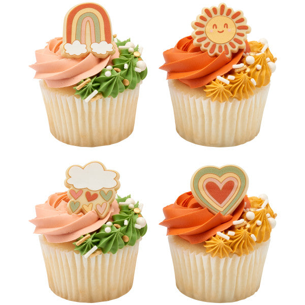 ¿Alguien ha visto mi corona de flores? ¡Este es para todas las chicas boho! Este adorable surtido de cupcakes presenta un estilo bohemio y una combinación de colores con colores neutros y apagados para lograr ese ambiente relajado y fluido que todos amamos. Con un anillo de arco iris, corazón, sol y nube de lluvia, este surtido seguramente hará realidad todos tus sueños de fiesta bohemia.