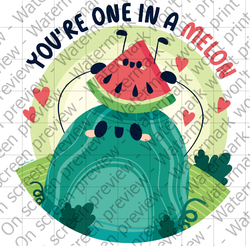 Esta imagen muestra una rodaja de sandía encima de una sandía con corazones y la frase "Eres uno en un melón". Completa la celebración con esta imagen de adorno de pastel comestible.