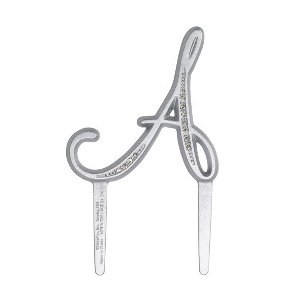 Monograms have a silver finish and shiny, clear rhinestone accents. Each features picks at the bottom for easy insertion into cakes. Available in large and small sizes. Height does not include pick.