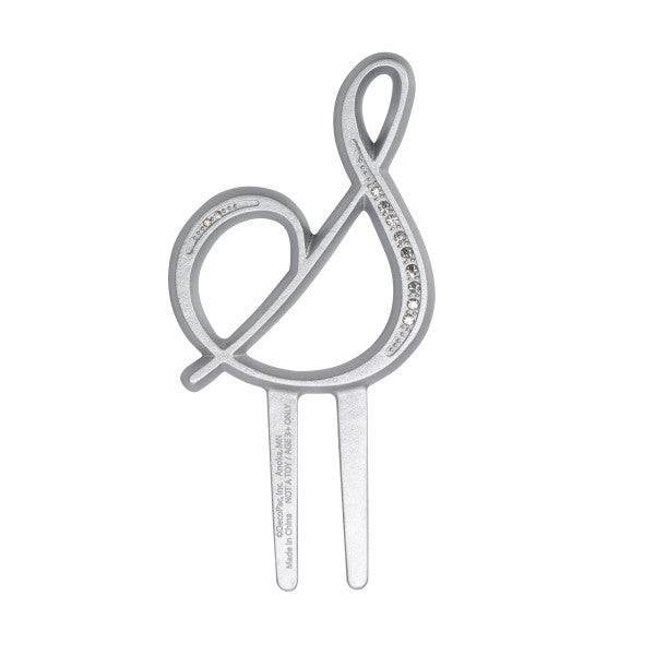 Monograms have a silver finish and shiny, clear rhinestone accents. Each features picks at the bottom for easy insertion into cakes. Available in large and small sizes. Height does not include pick.