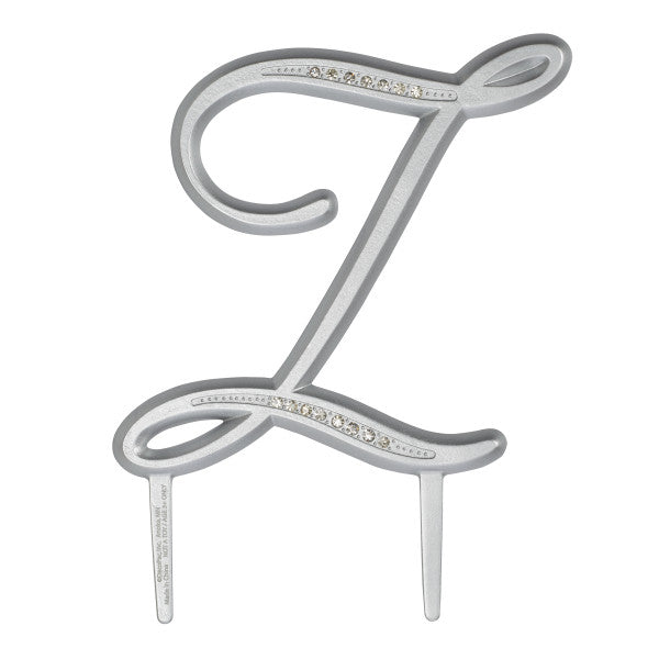 Monograms have a silver finish and shiny, clear rhinestone accents. Each features picks at the bottom for easy insertion into cakes. Available in large and small sizes. Height does not include pick.