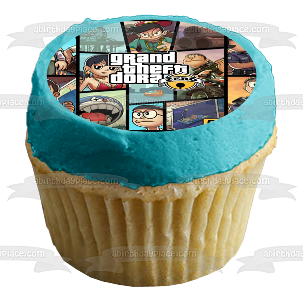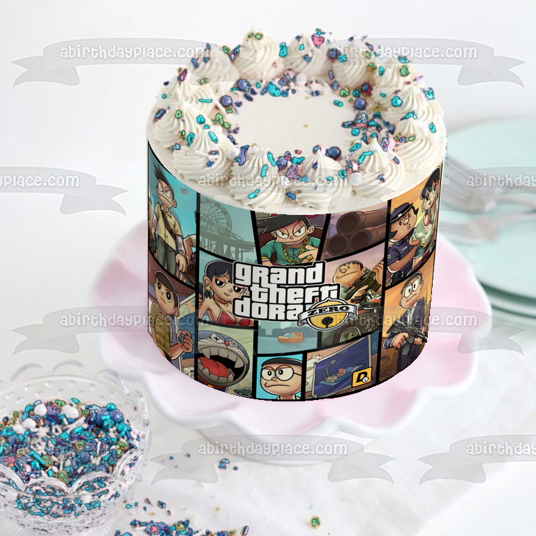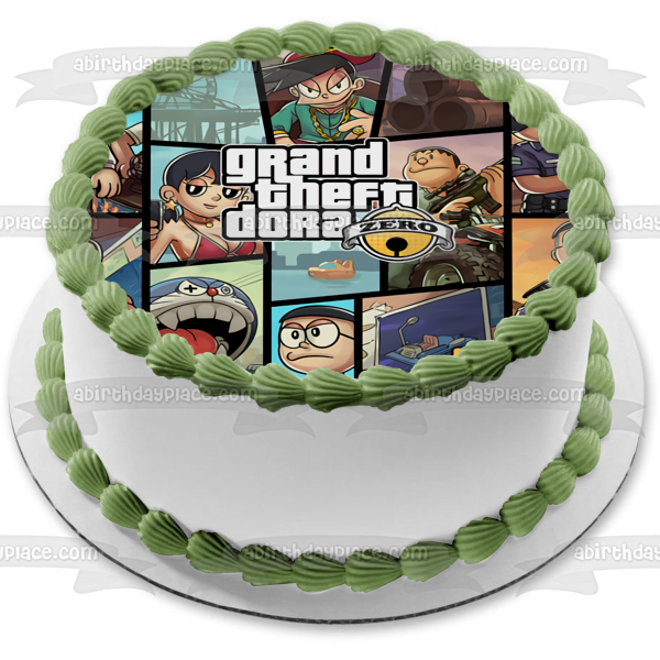 Celebrate your special day with this Grand Theft Dora themed Edible Cake Topper Image featuring Zero and Doraemon!