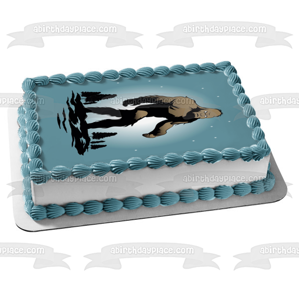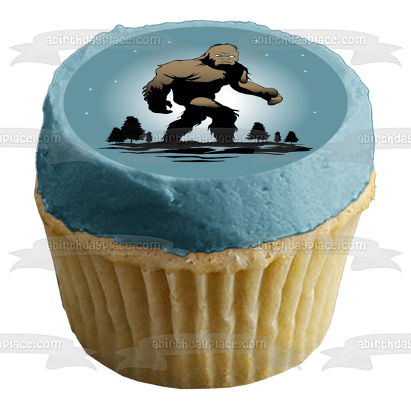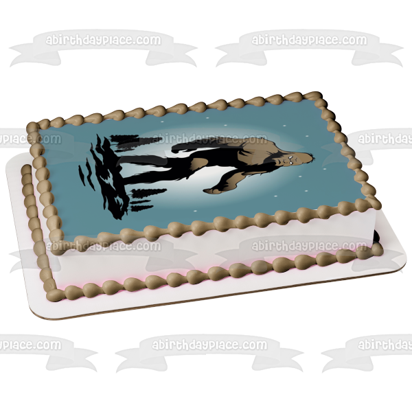 Decorate your cake with this Bigfoot themed Edible Cake Topper Image depicting Sasquatch, the Official Town Animal of Whitehall, New York, walking in the woods at night time!