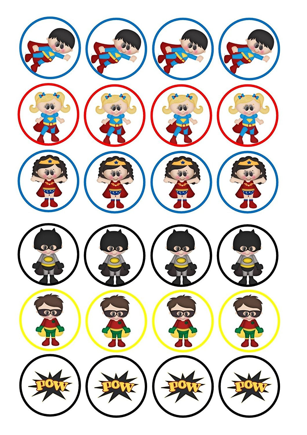 Decorate your cupcakes with these Edible Cupcake Topper Images featuring Superman, Supergirl, Wonder Woman, Batman, Robin and a comic book style POW!