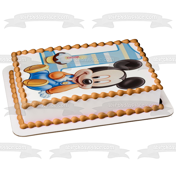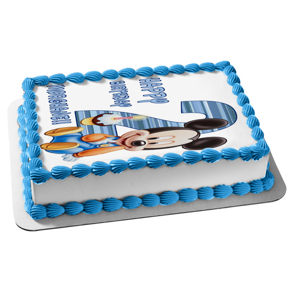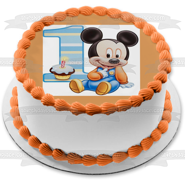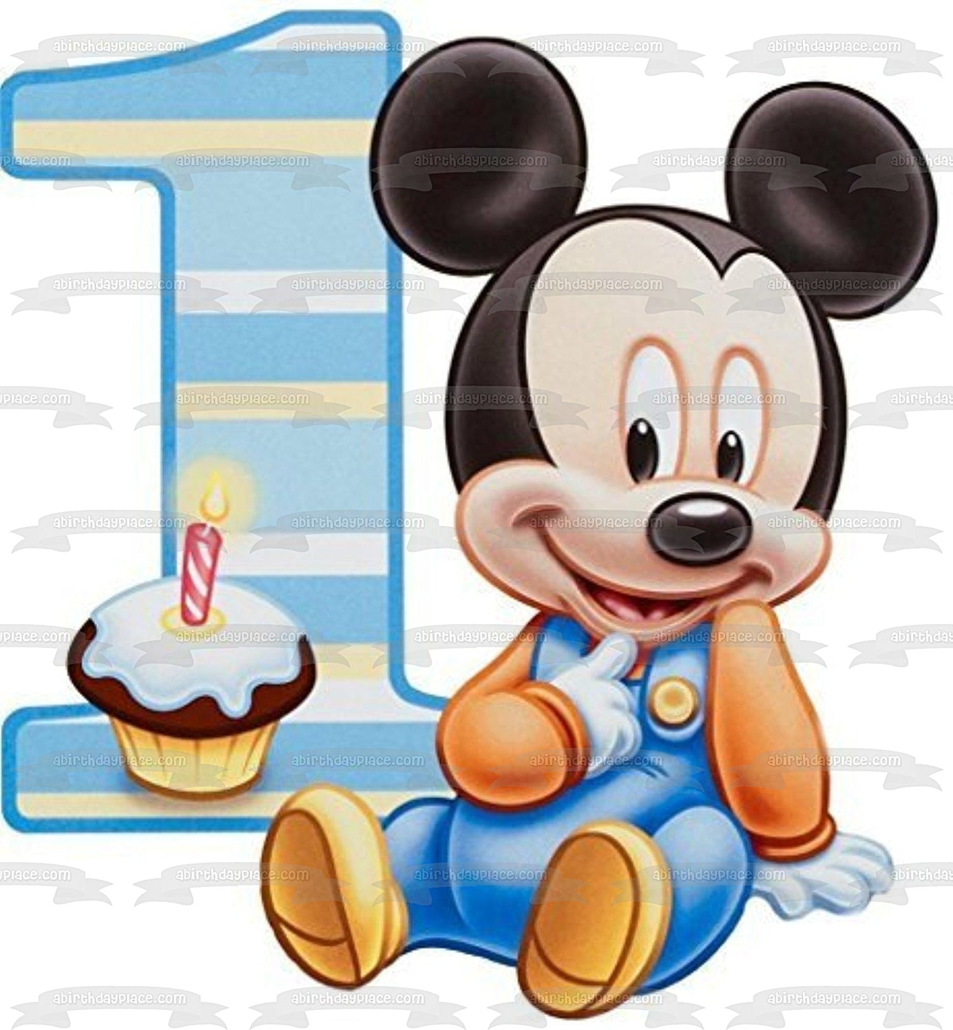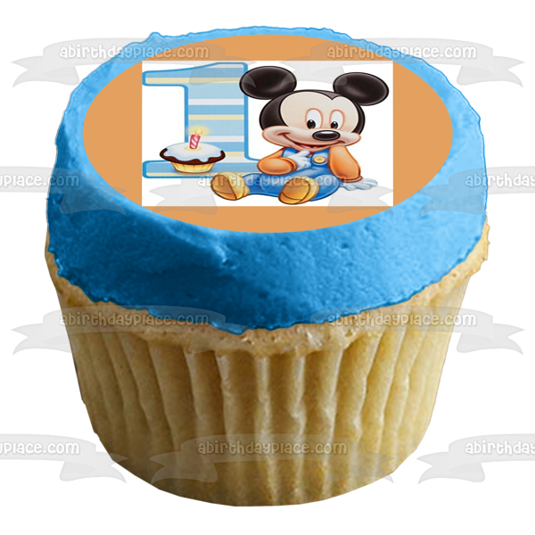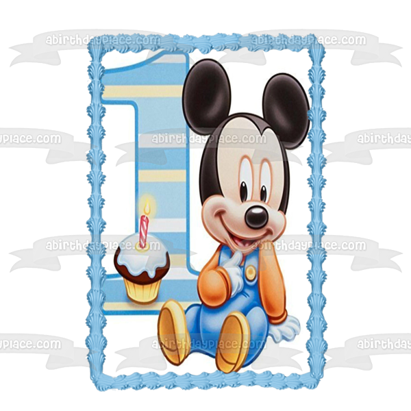 Decorate your cake with this Baby Mickey Mouse themed Edible Cake Topper Image featuring Baby Mickey Mouse next to a number 1 with a Cupcake and a Candle!