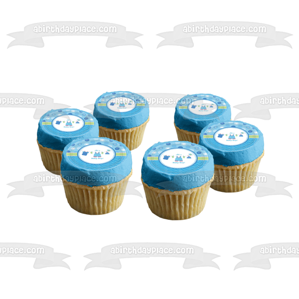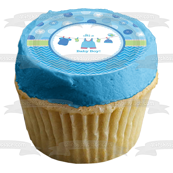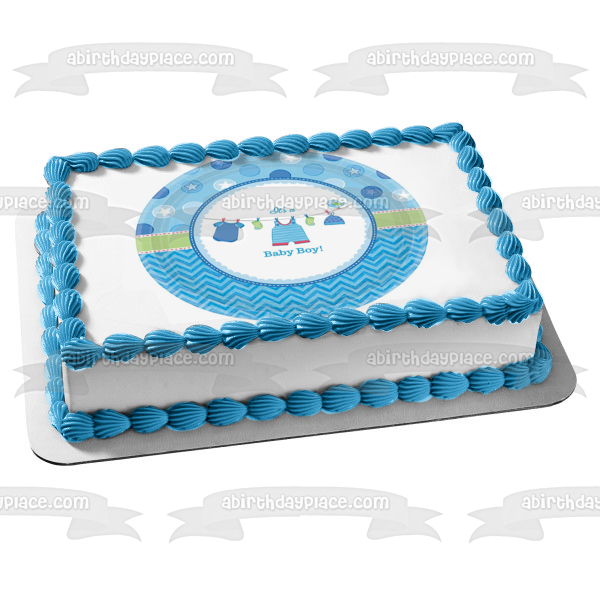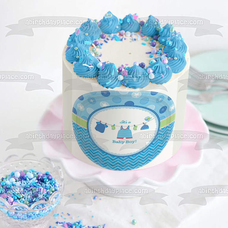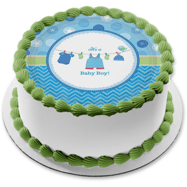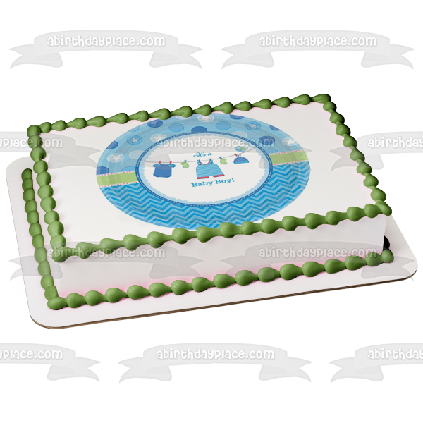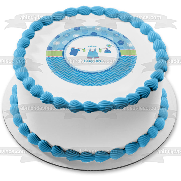 Celebrate your very special day with this It's a Baby Boy themed Edible Cake Topper Image featuring Boy Outfits, Socks and Hats on a Clothesline!