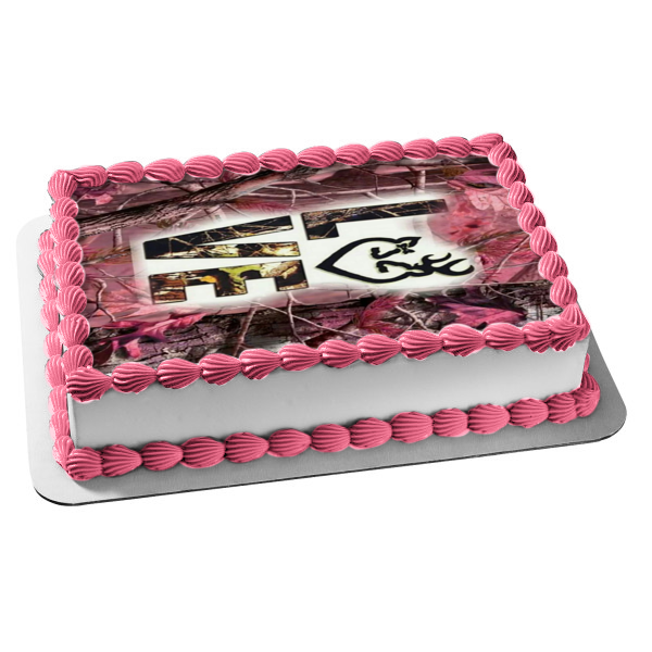 Celebrate your special day with this Pink Camouflage themed Edible Cake Topper Image featuring Pink Trees and Leaves and a LOVE Buck and Doe Head Heart!