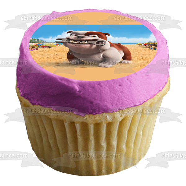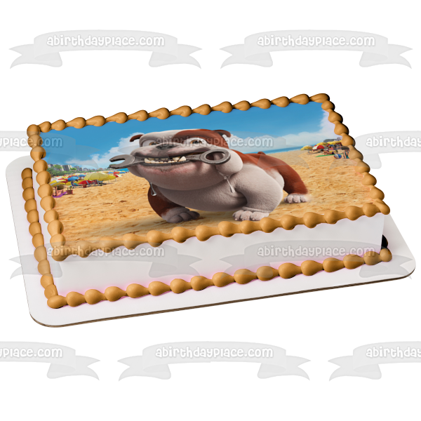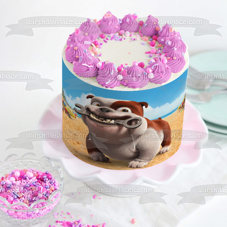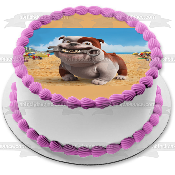 Celebrate your day with this Rio themed Edible Cake Topper Image featuring Luiz, the Bulldog Mechanic with a Wrench on the Beach!