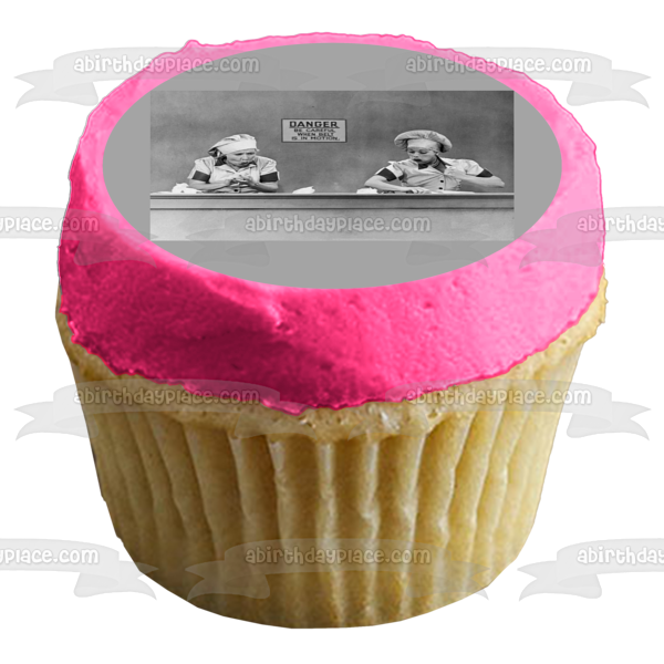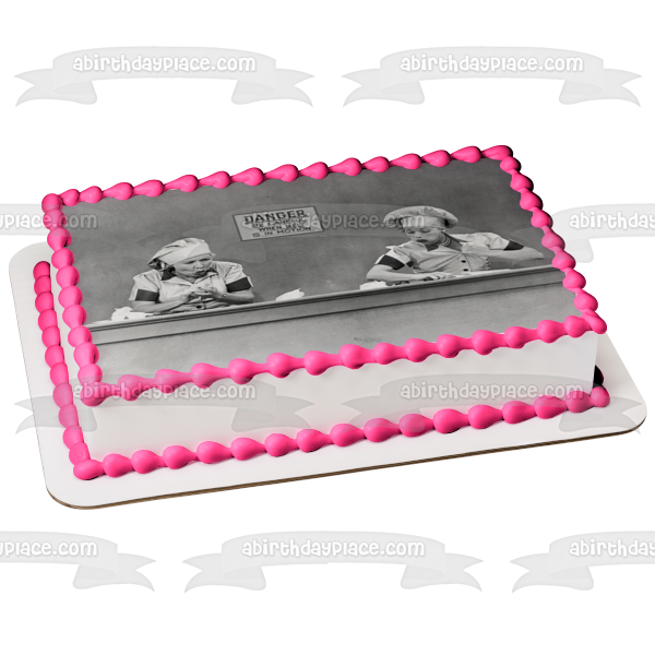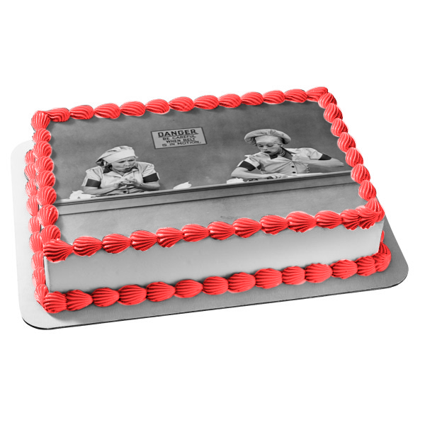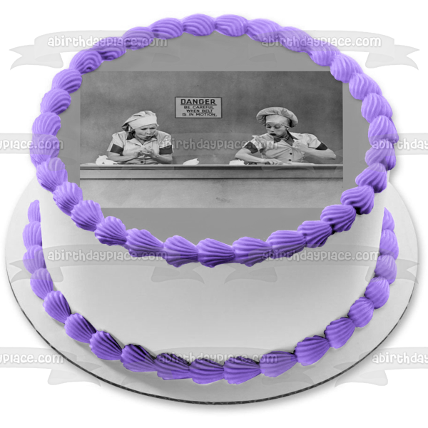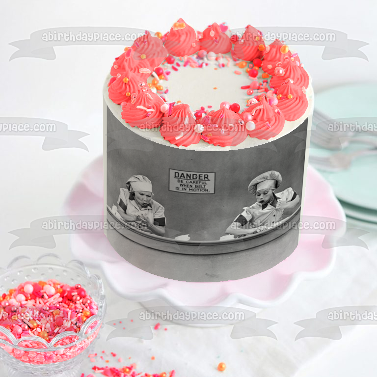 Celebrate your I Love Lucy fan with this Edible Cake Topper Image featuring Lucy and Ethel at work in front of a sign that reads "Danger Be Careful When Belt Is In Motion"