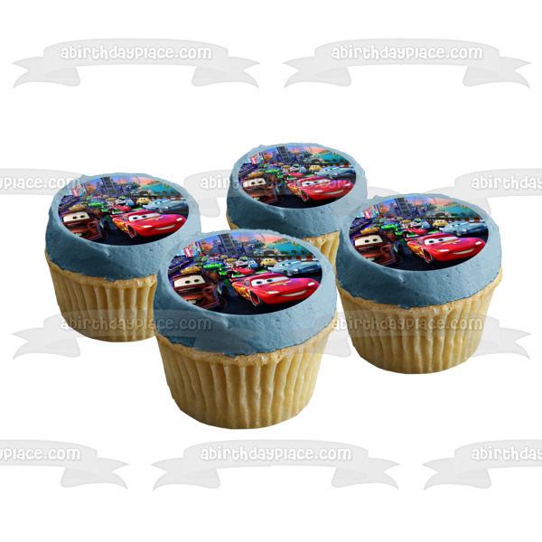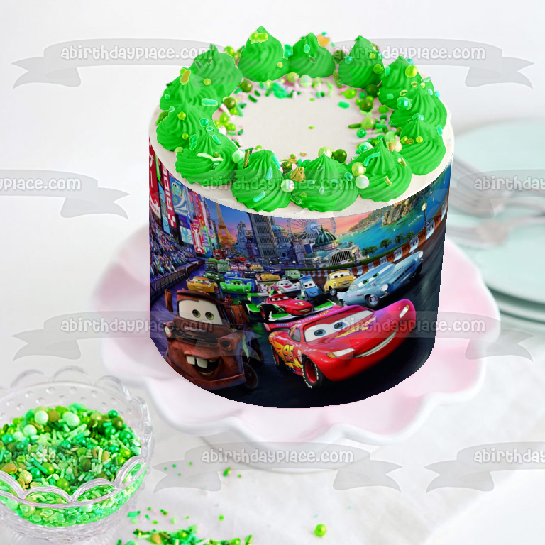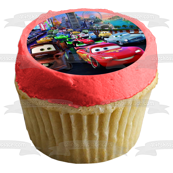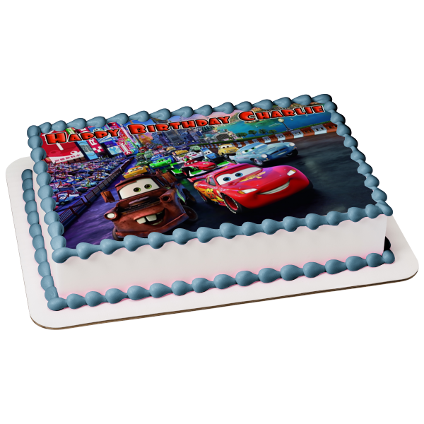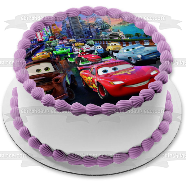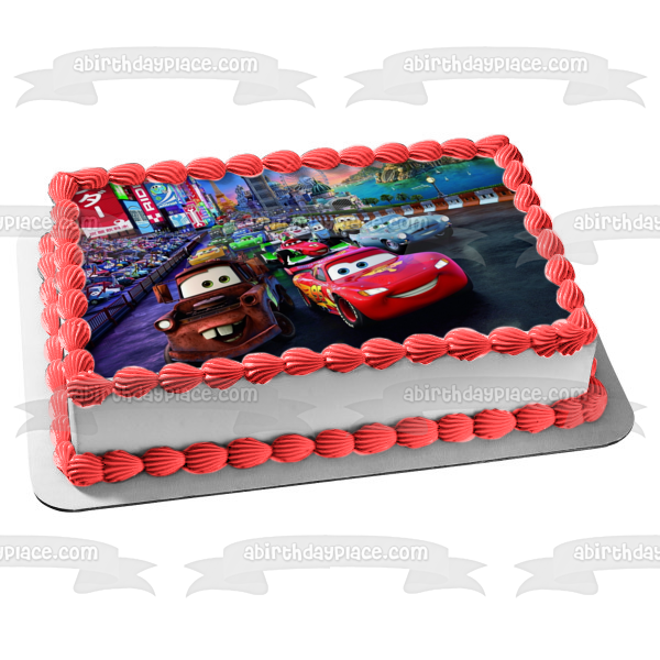 Celebrate your Cars fan with this Edible Cake Topper Image featuring Lightning McQueen, a Race Track, Mater, Sally, Filmore and Luigi racing together!