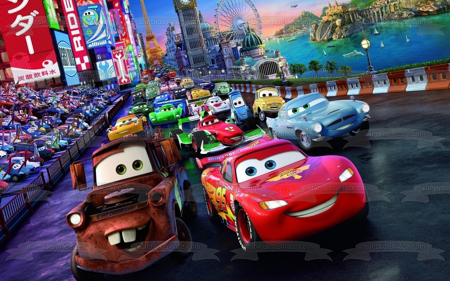 Cars Lightening McQueen Race Track Mater Sally Filmore and Luigi Racing Together Edible Cake Topper Image ABPID00528