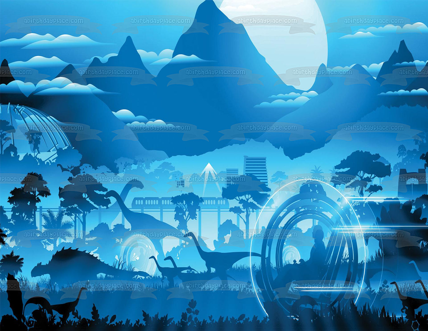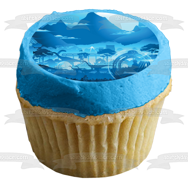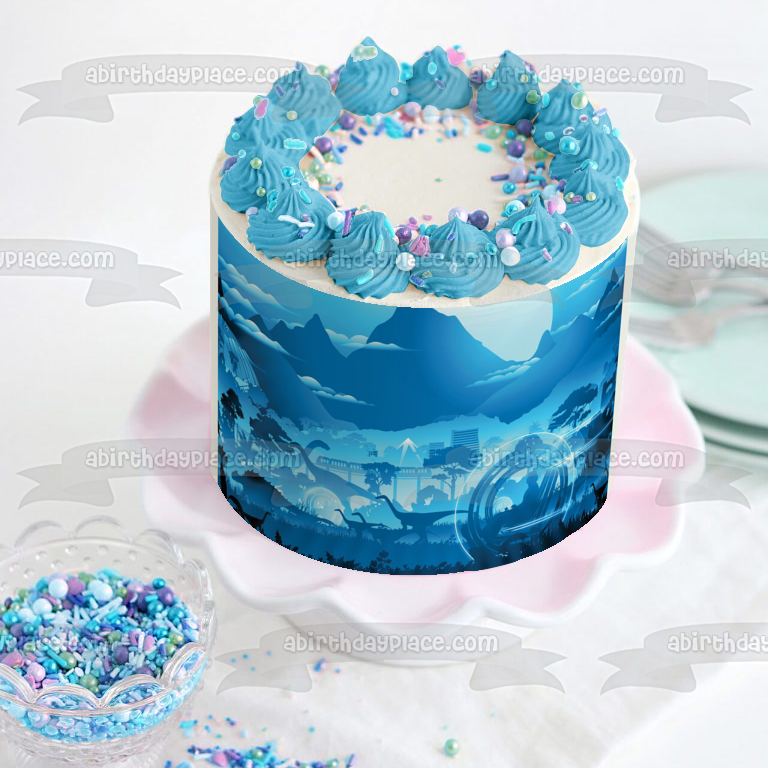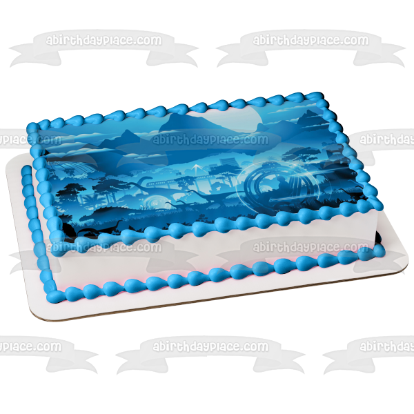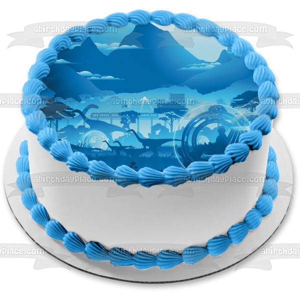 Celebrate your Dinosaur fan with this Edible Cake Topper Image featuring a Jurassic Dinosaur Scene in shades of Blue!