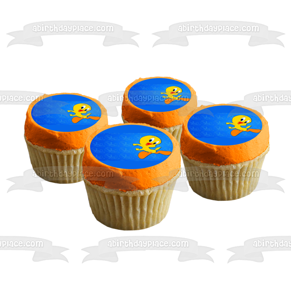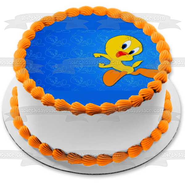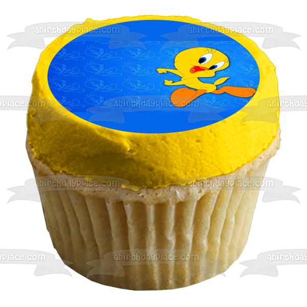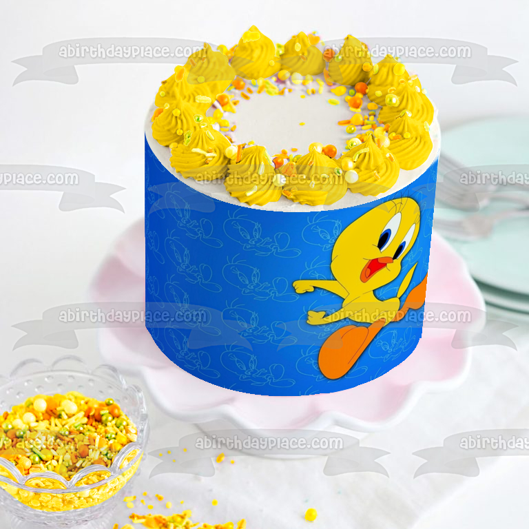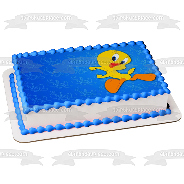 Celebrate your Looney Tunes fan with this Edible Cake Topper Image featuring Tweety Bird and a Blue Background!