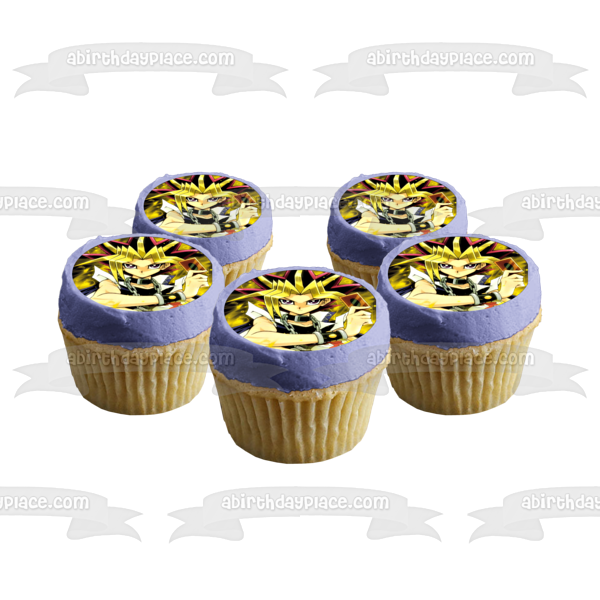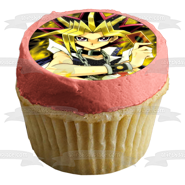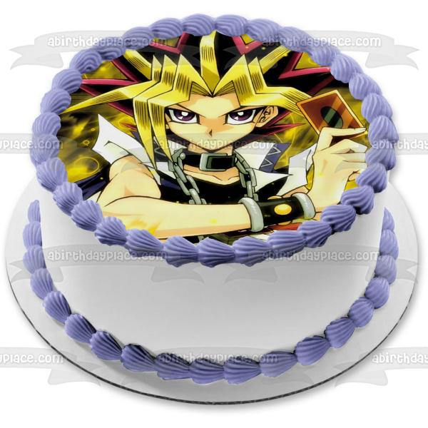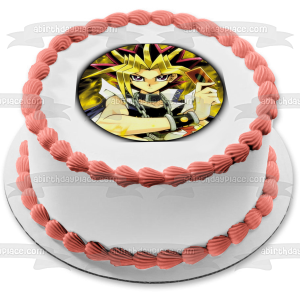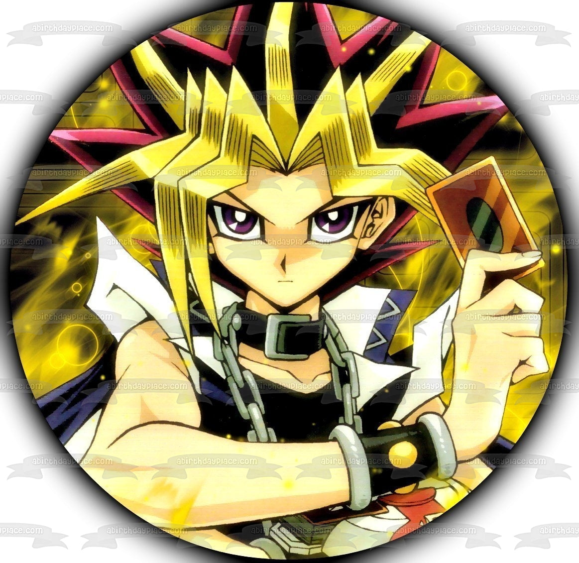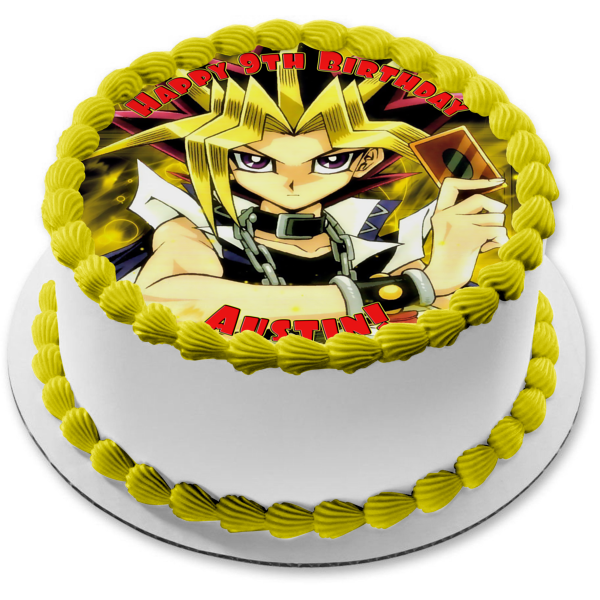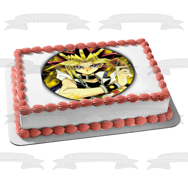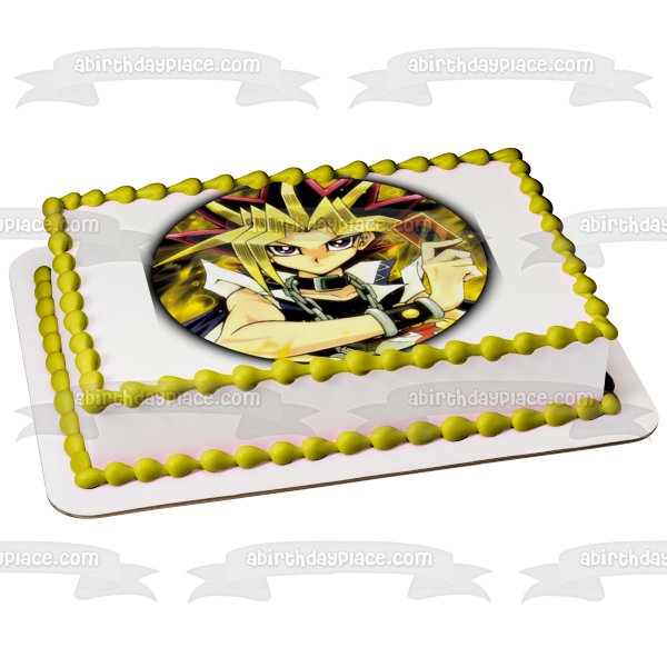 Celebrate your Yu-Gi-Oh fan with this Edible Cake Topper Image featuring Yugi Mutou and a Yellow Background!
