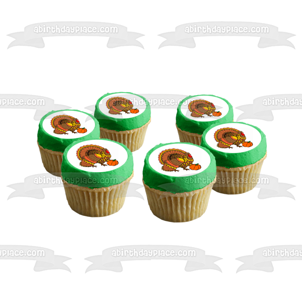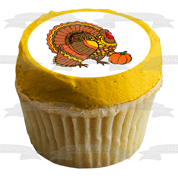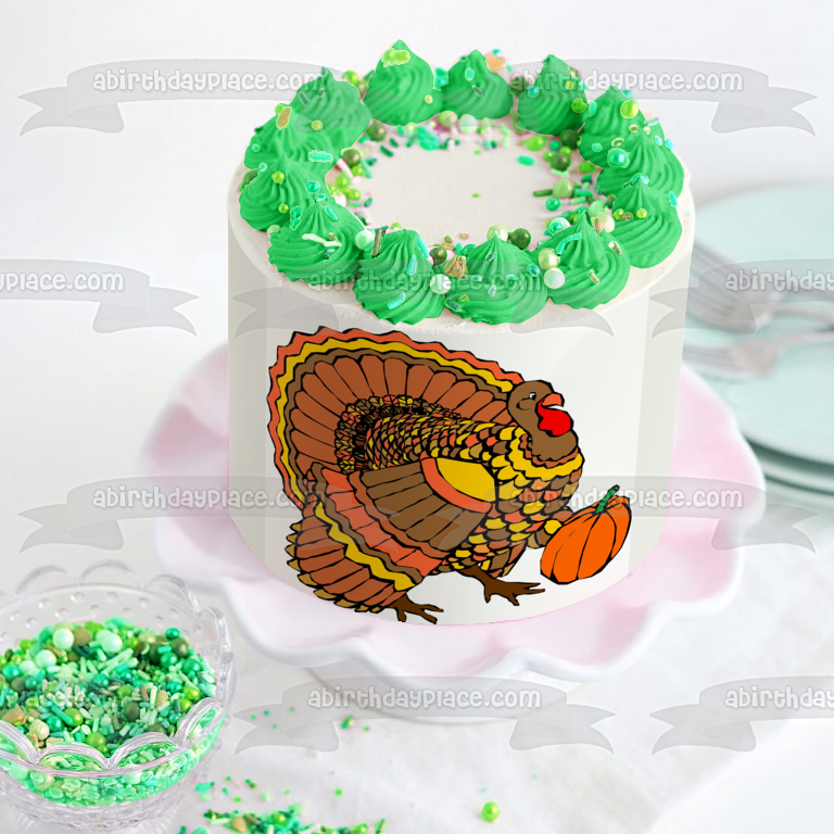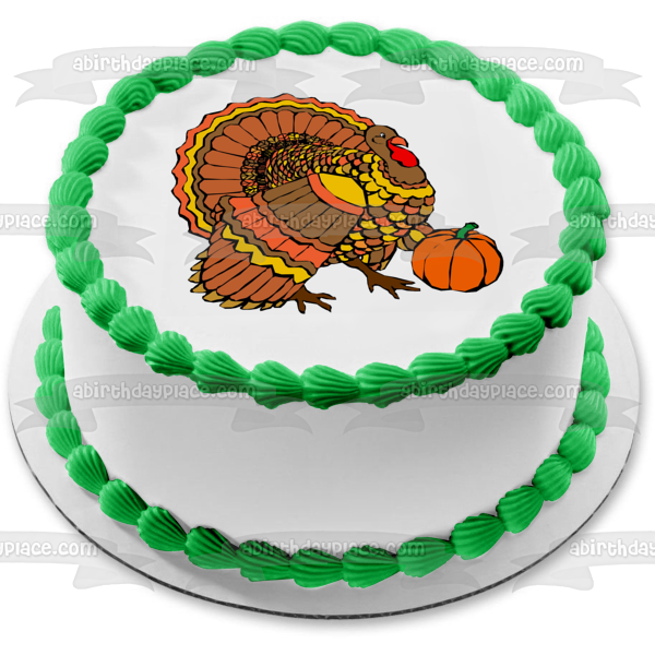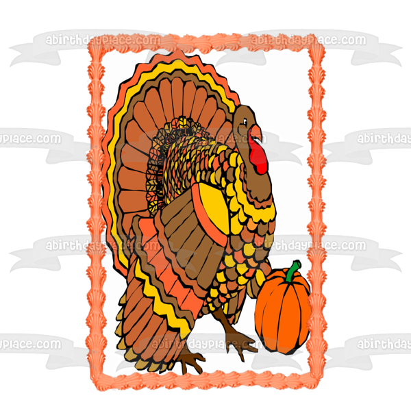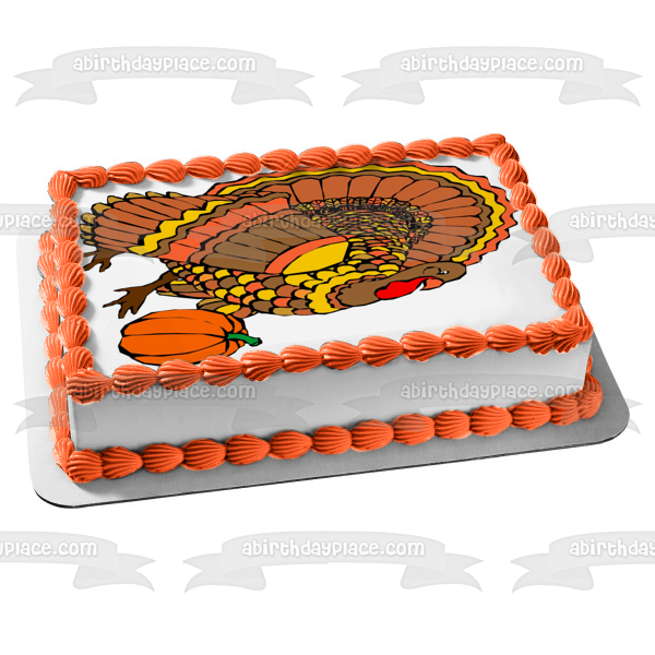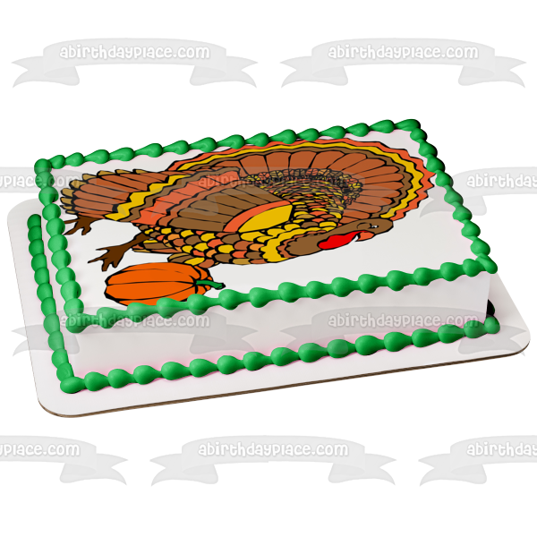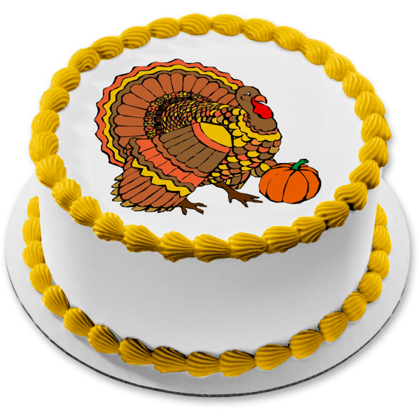 Celebrate Thanksgiving with this Edible Cake Topper Image featuring a Colorful Turkey and a Pumpkin!