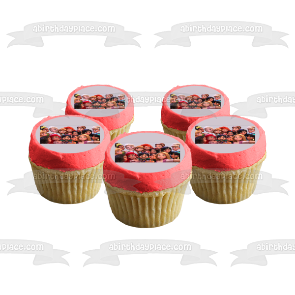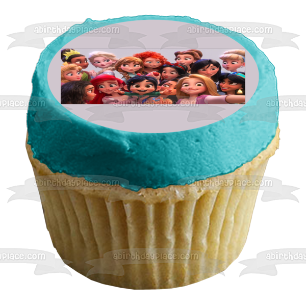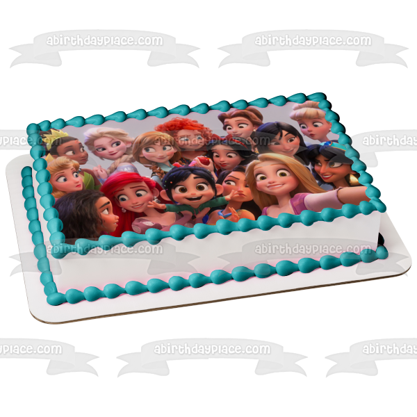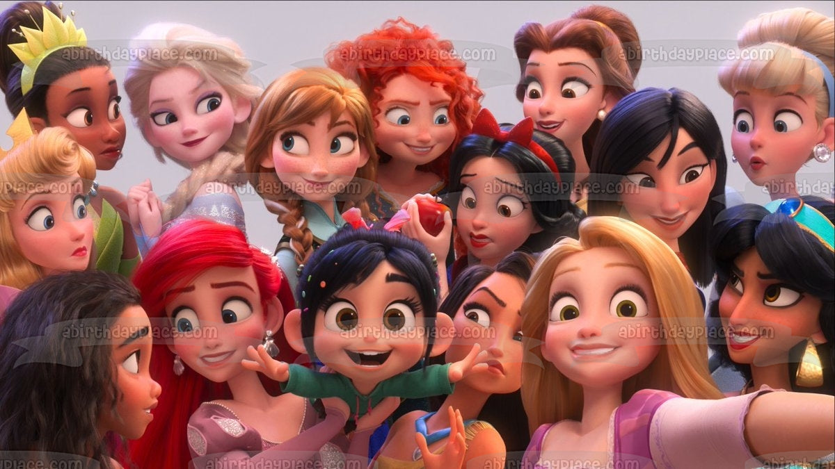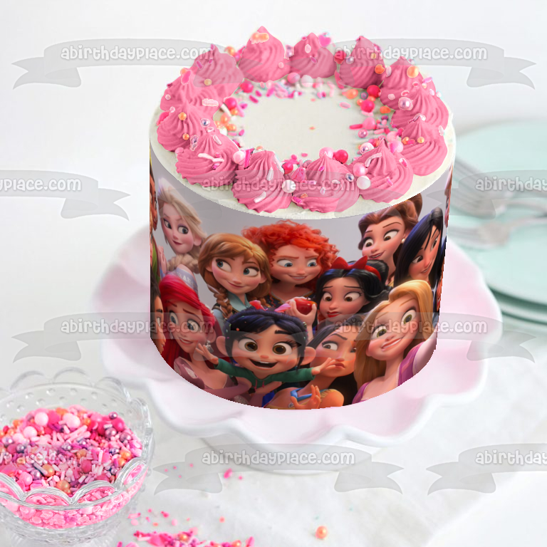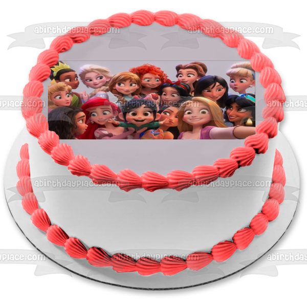 Celebrate your day with this Wreck-It Ralph Princesses themed Edible Cake Topper Image featuring Rapunzel, Belle, Ariel, Merida, Jasmine, Tiana, Anna, Elsa and Cinderella!