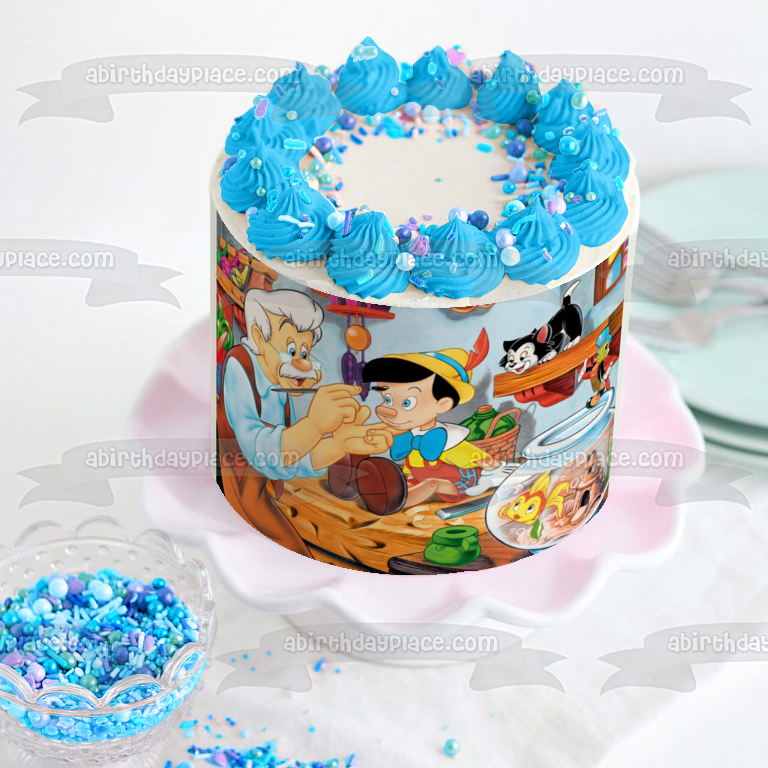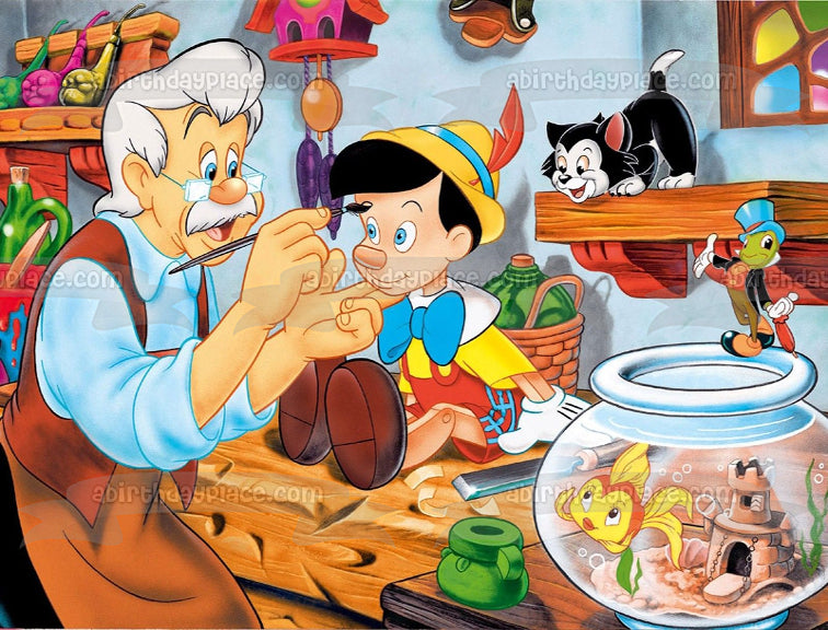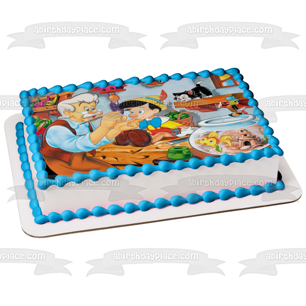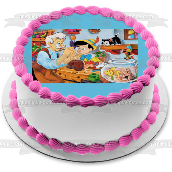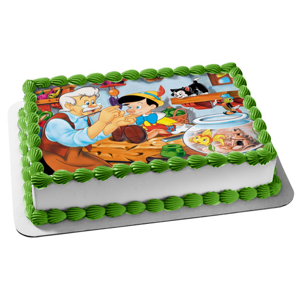 Celebrate your day with this Edible Cake Topper Image featuring Pinocchio, Jiminy Cricket, Mister Geppetto and Cleo!