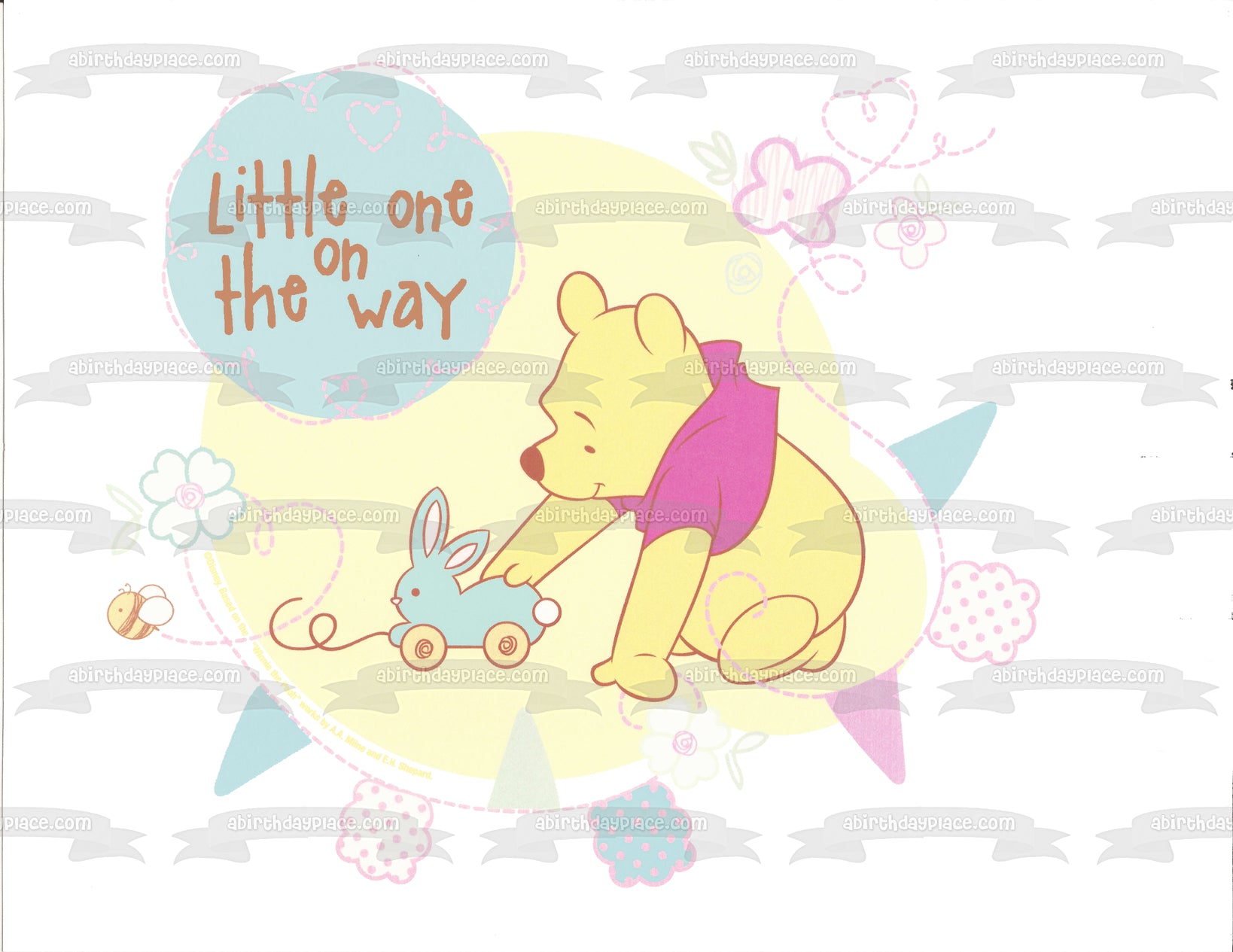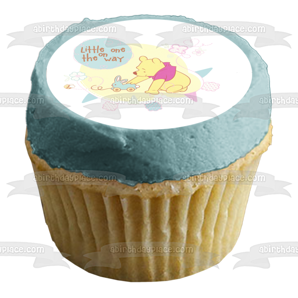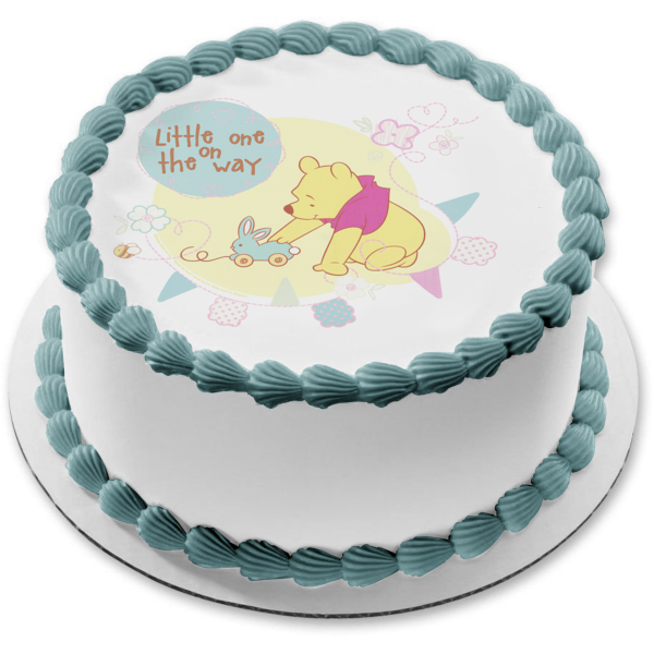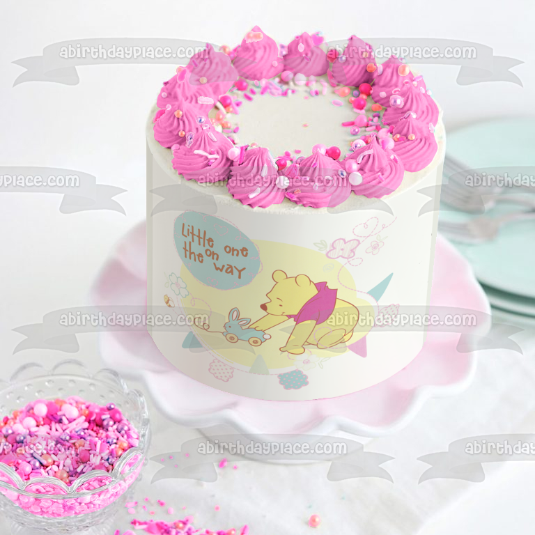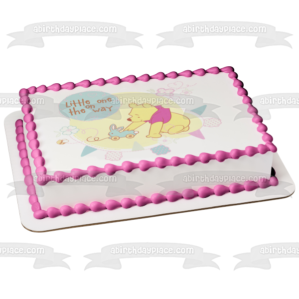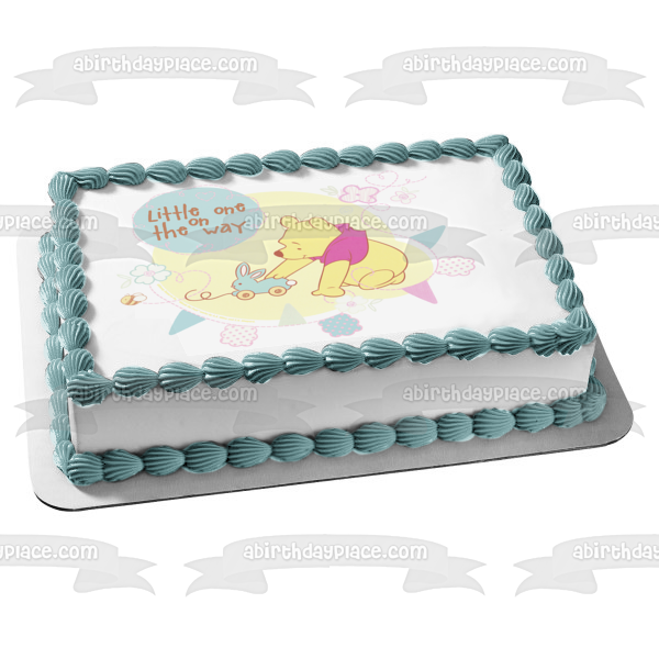 Celebrate your Baby Shower with this Edible Cake Topper Image featuring Winnie the Pooh and says "Little One On The Way"!