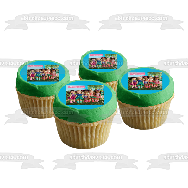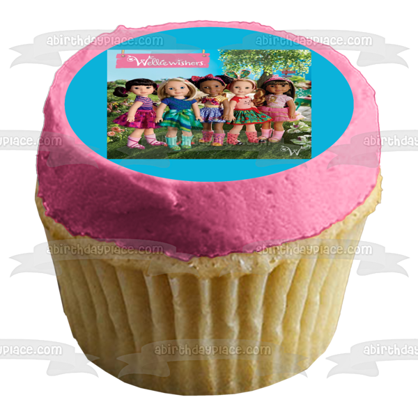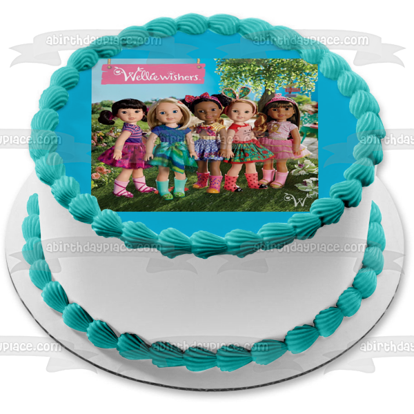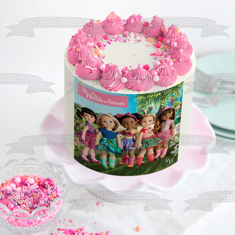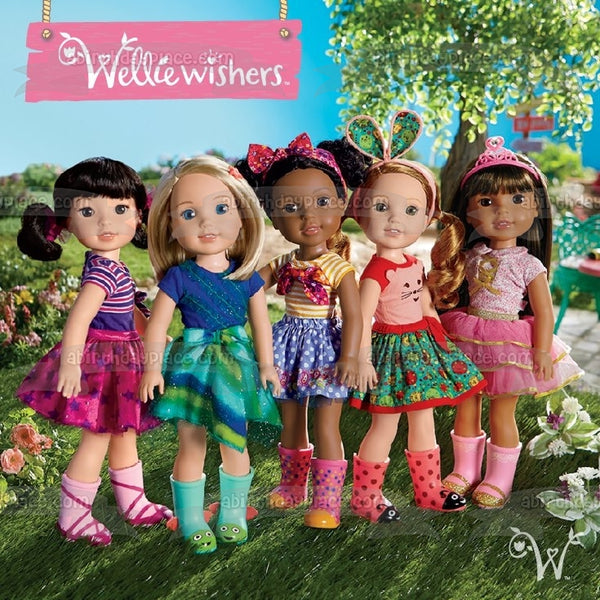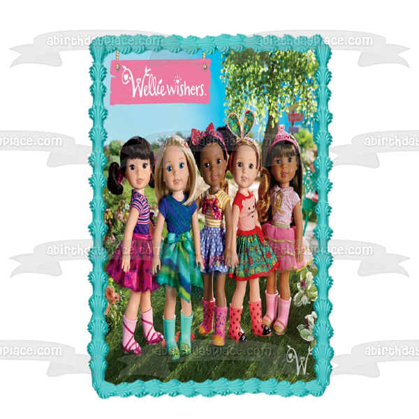 Celebrate your special day with this American Girl themed Edible Cake Topper Image featuring the Wellie Wishers, Emerson, Camille, Ashlyn, Willa and Kendall!