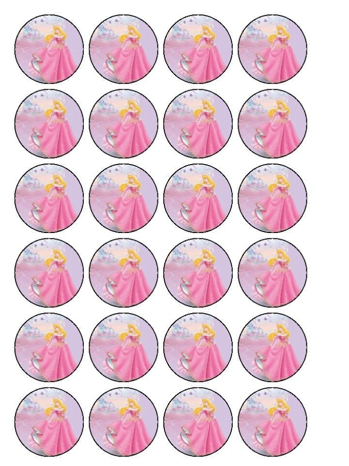Celebrate your special day with these 24 Count Sleeping Beauty themed Edible Cupcake Topper Images featuring Aurora!