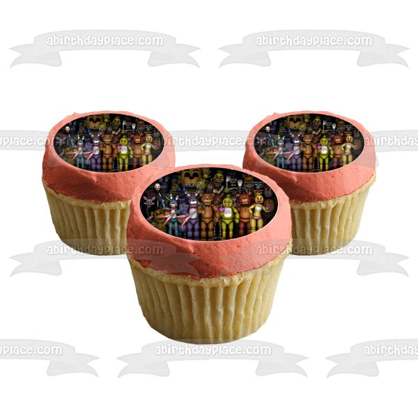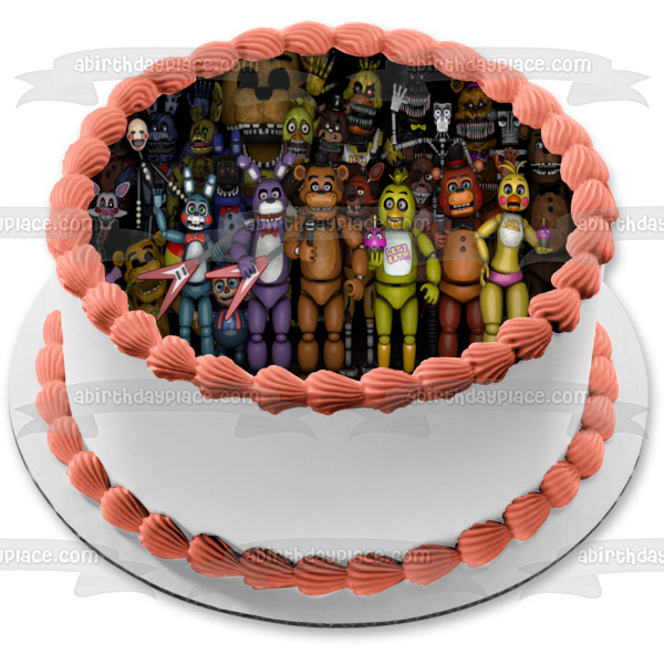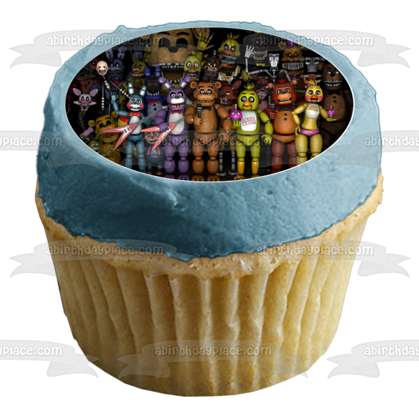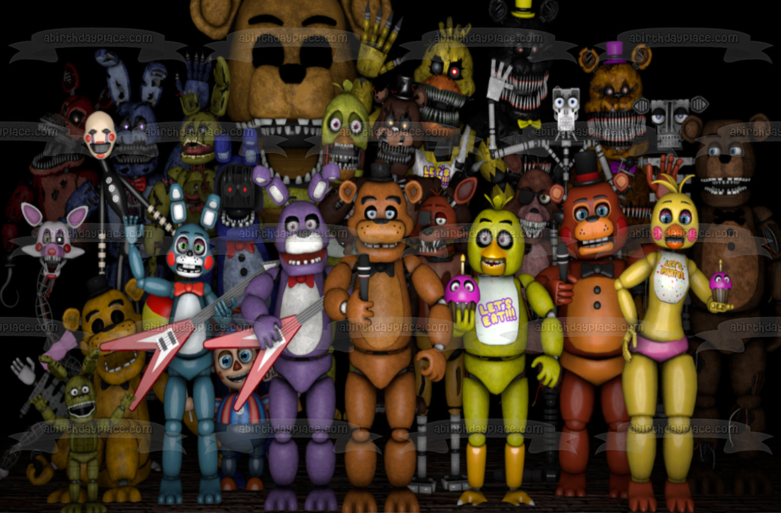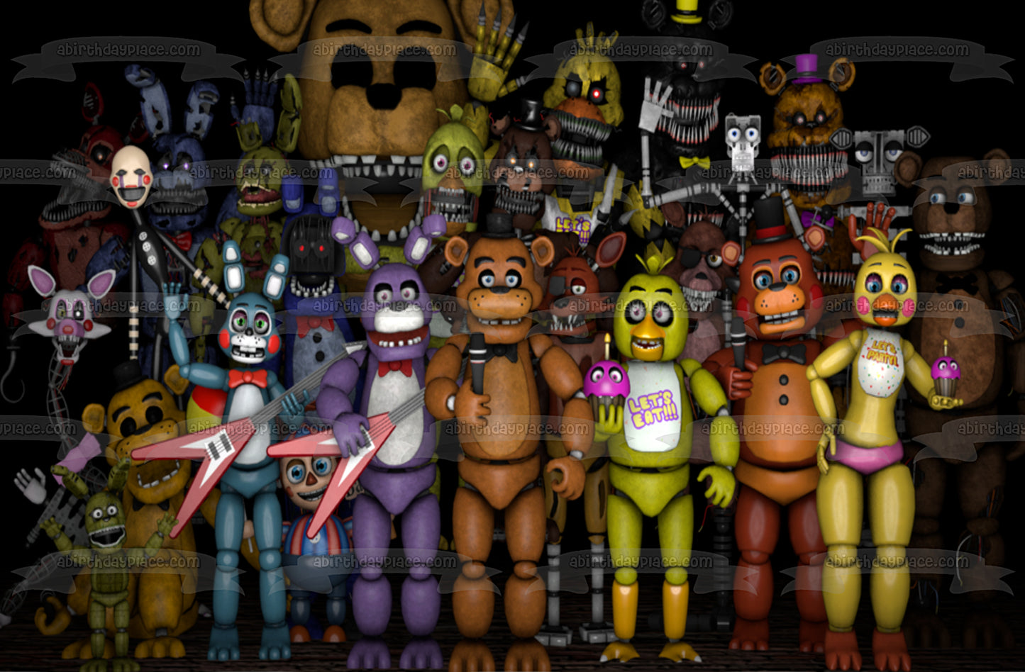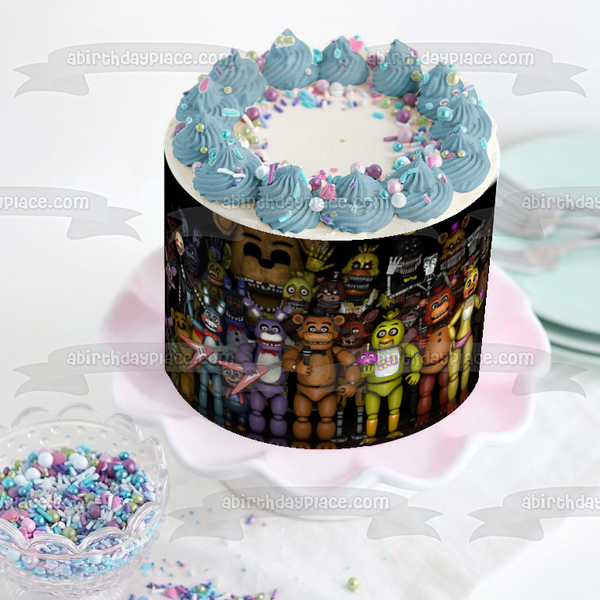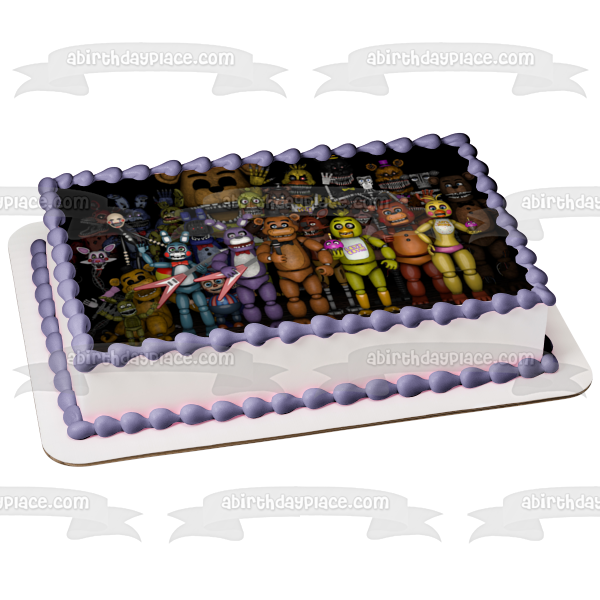 Celebrate your day with this Five Nights at Freddy's themed Edible Cake Topper Image featuring Bonnie, Chica, Toy, Chica and Lefty!