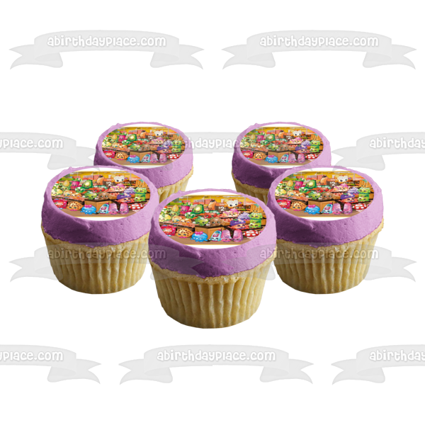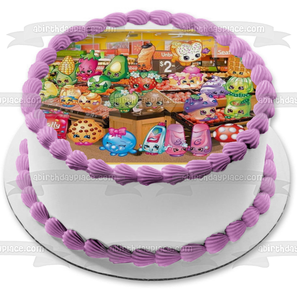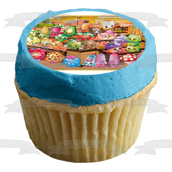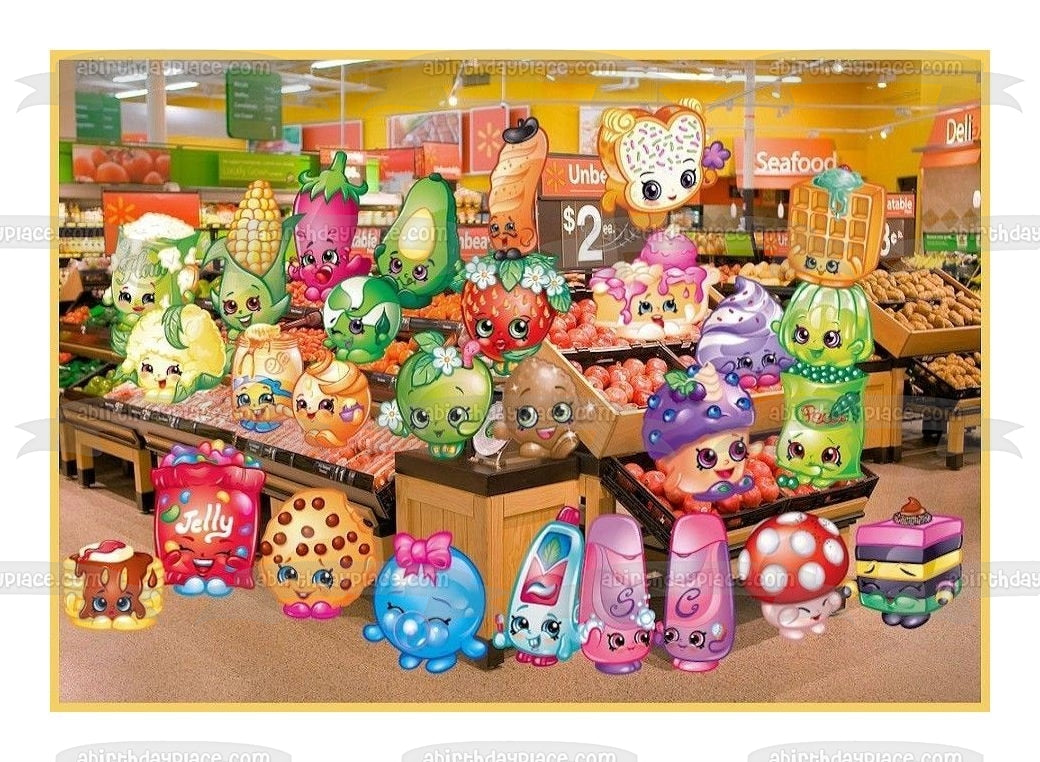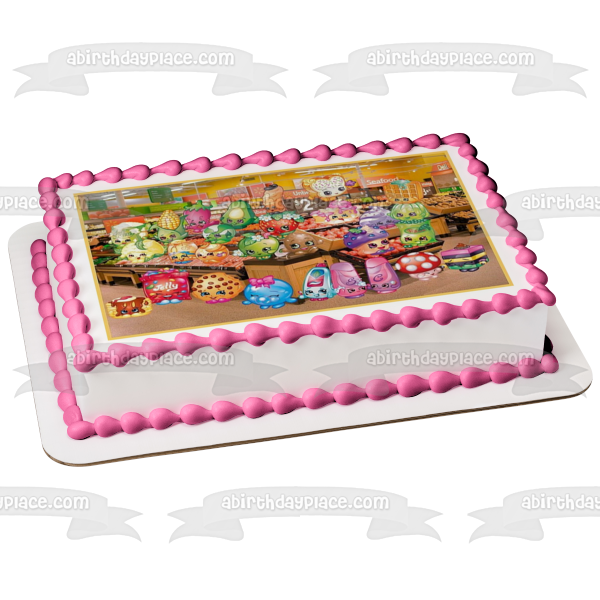 Decorate your cake with this Shopkins themed Edible Cake Topper Image featuring Kooky Cookie, D'lish Donut, Cupcake Chic, Apple Blossom, Strawberry Kiss, Lippy Lips, Scrubs, Dippy Avocado, Angry Birds Pig, Silly Chilie and Chloe Flower!