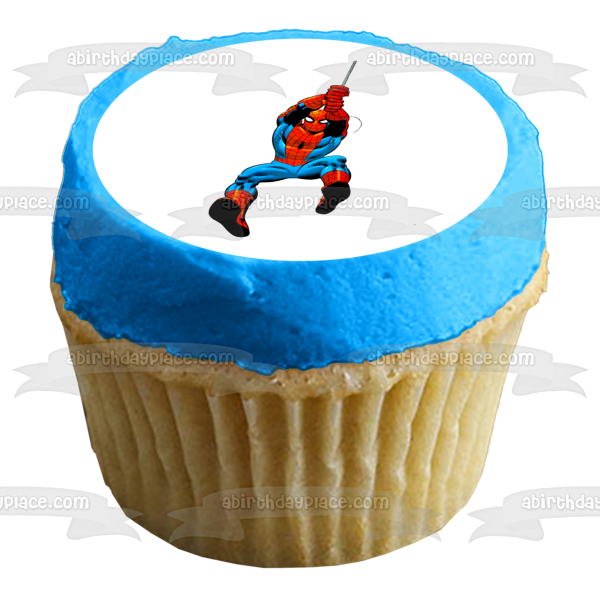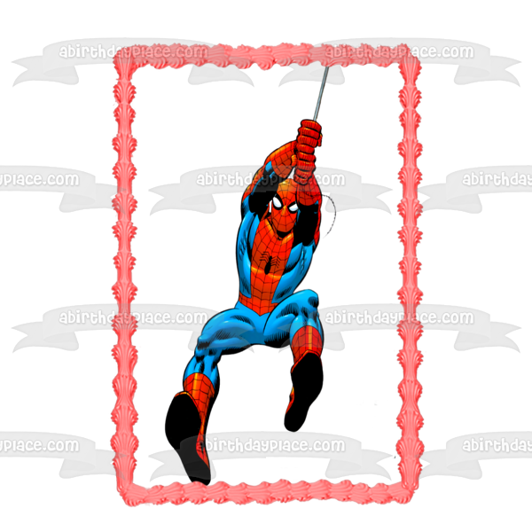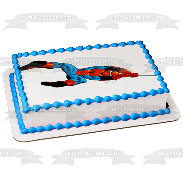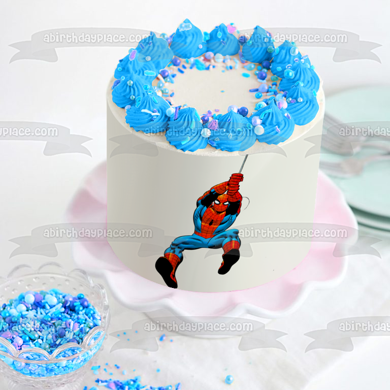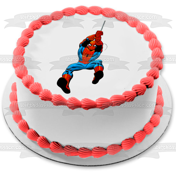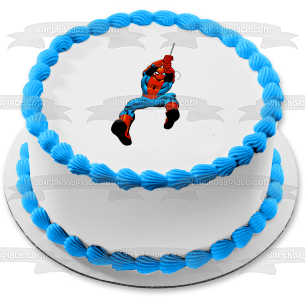 Decorate your cake with this Superhero themed Edible Cake Topper Image featuring Spider-Man swinging!