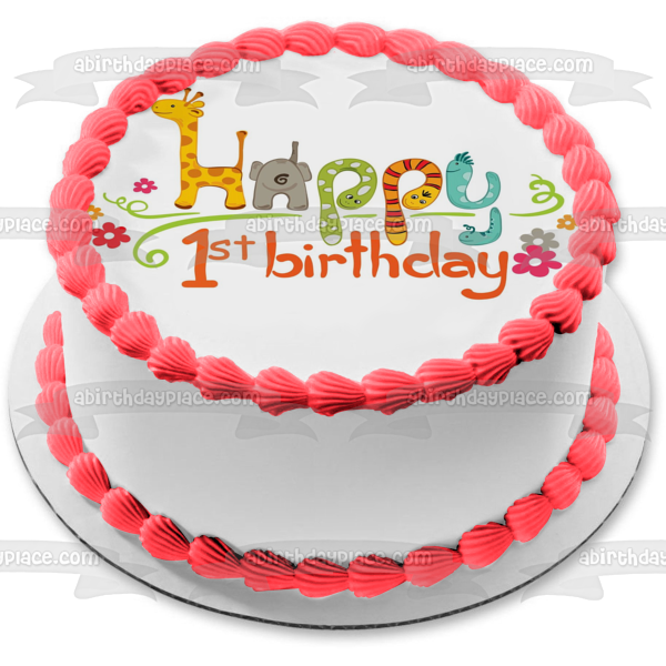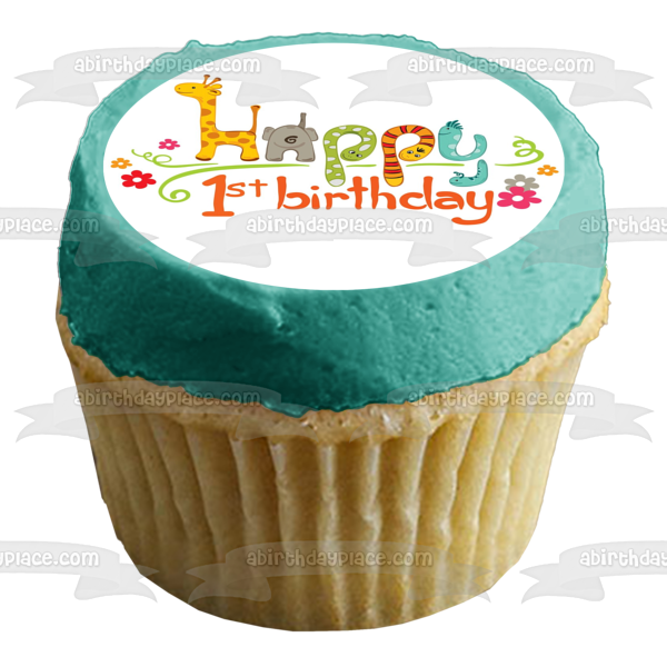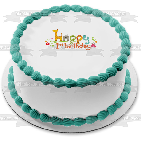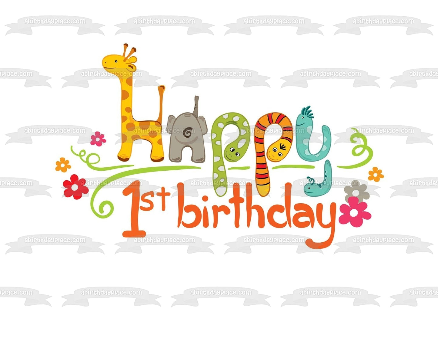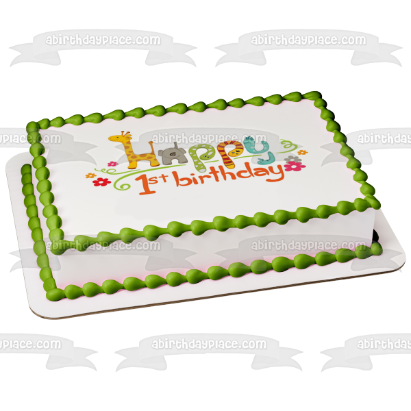 Celebrate your 1st Birthday with this Edible Cake Topper Image featuring the words "Happy 1st birthday" spelled out with Jungle Safari Animals!