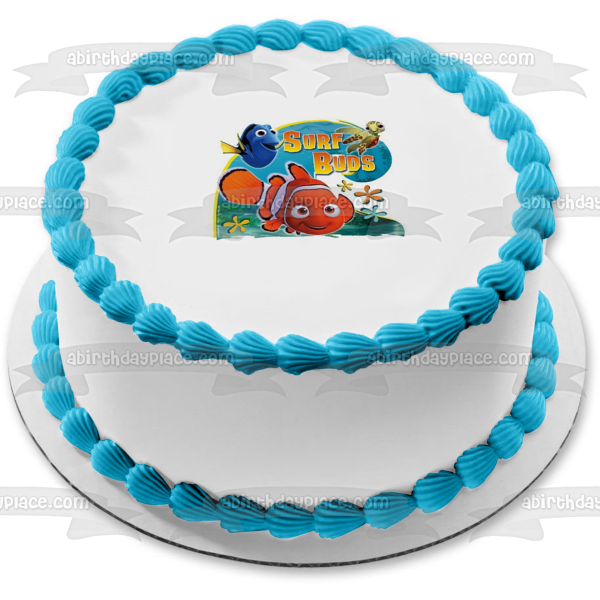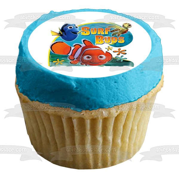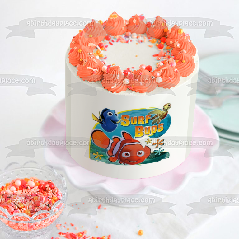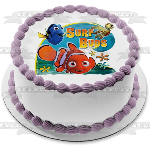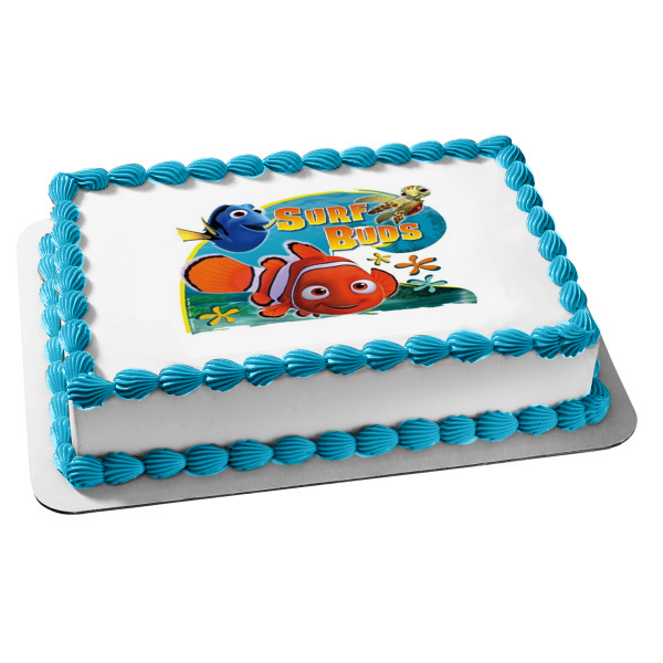 Celebrate your Fining Nemo fan with this Edible Cake Topper Image featuring Nemo, Dory and Squirt swimming around the words "Surf Buds"!