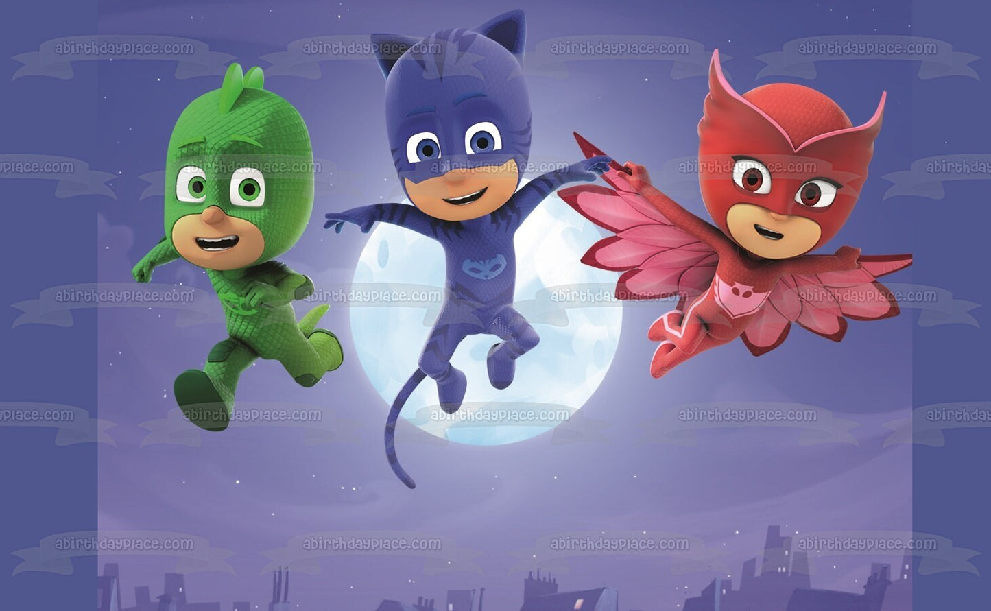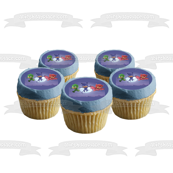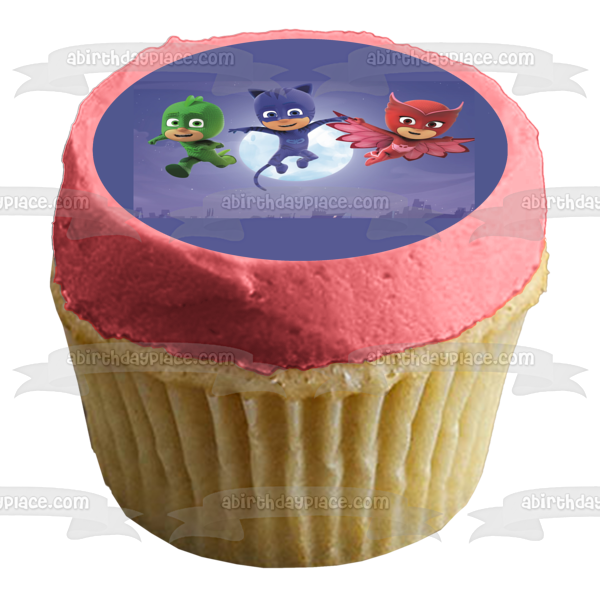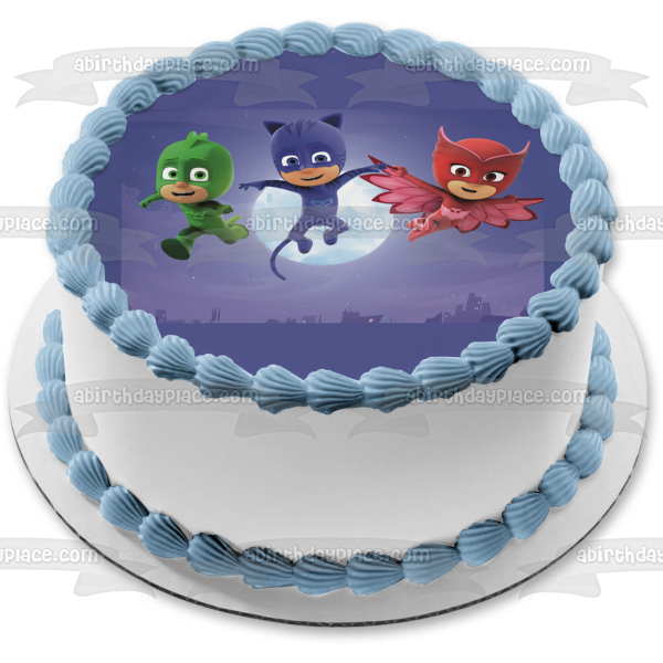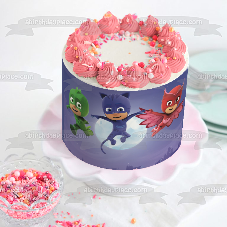 Celebrate your day with this PJ Masks themed Edible Cake Topper Image featuring Catboy, Owlette and Gekko in front of the Moon!