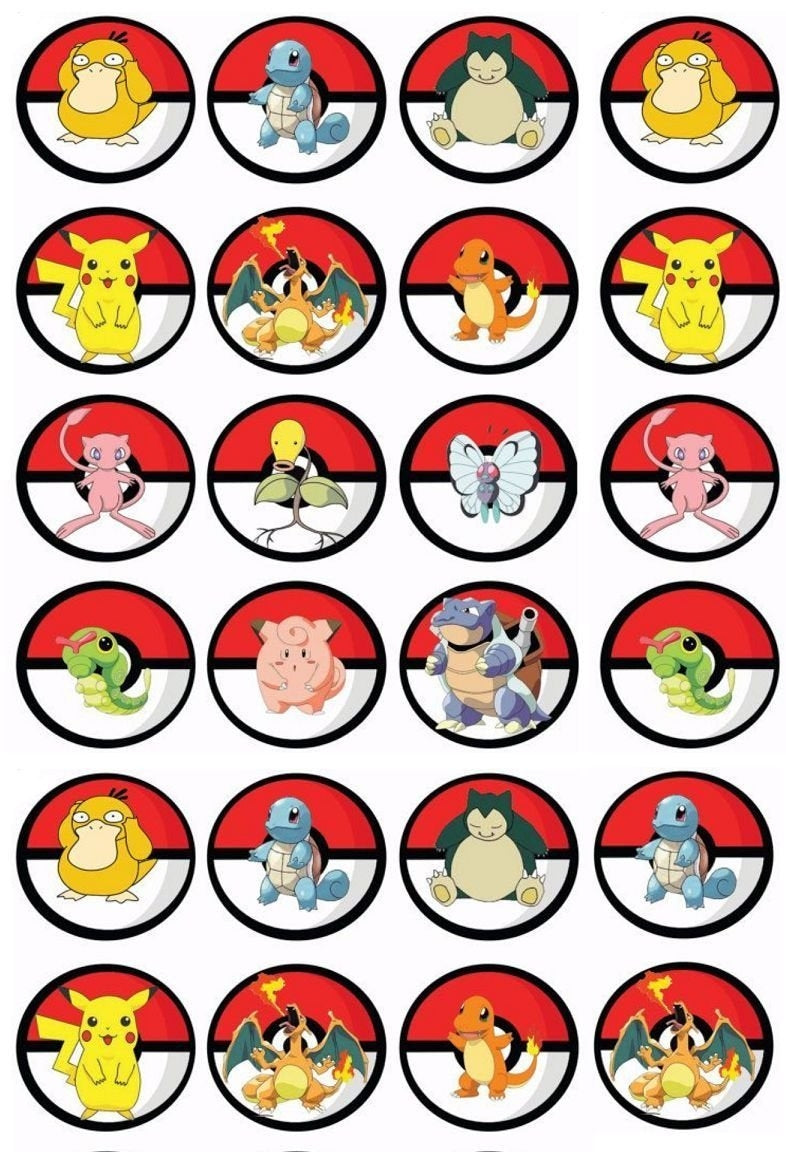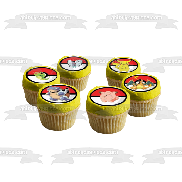 Decorate your Cupcakes with these 24 Count Pokemon Poke Ball themed Edible Cupcake Topper Images featuring Squirtle, Pikachu, Snorlax, Butterfree, Charmander and Psyeuck!