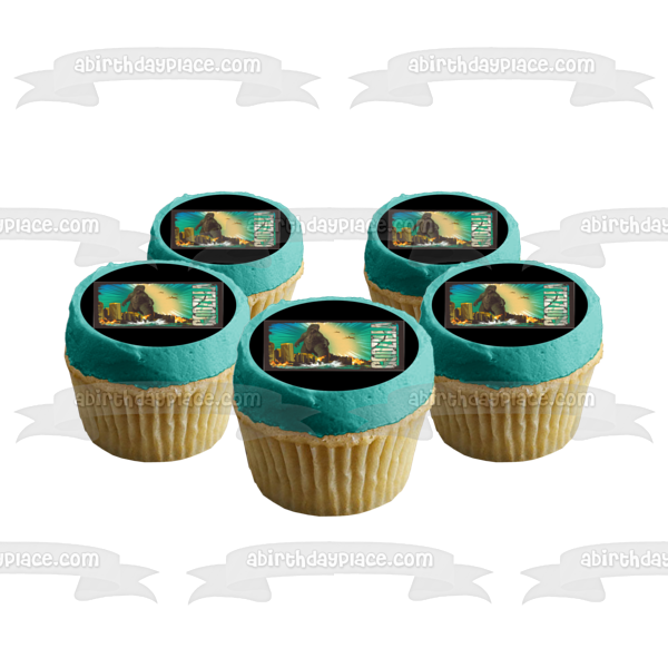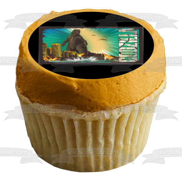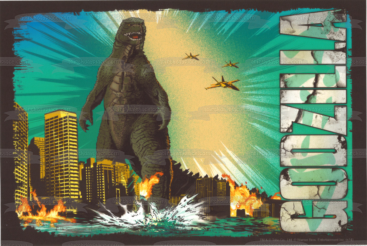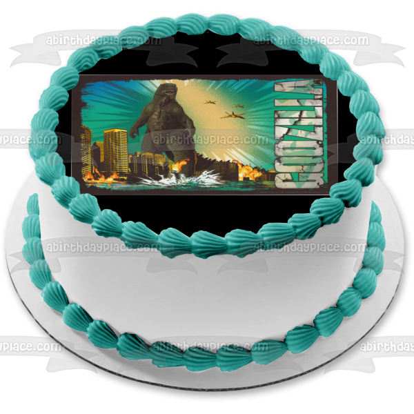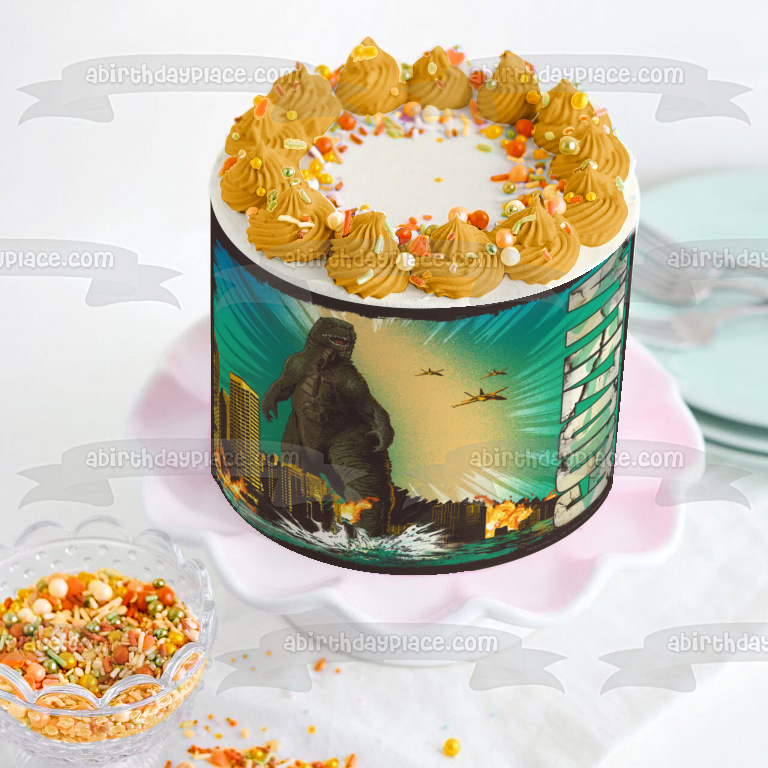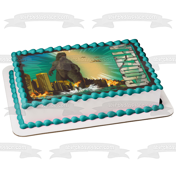 Celebrate your Godzilla fanatic with this Edible Cake Topper Image featuring Godzilla, a group of Jets, Buildings on Fire and Water!