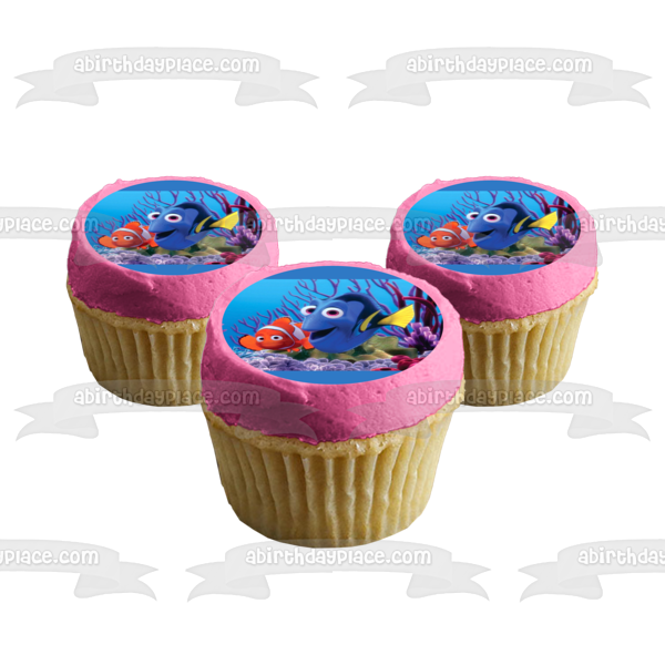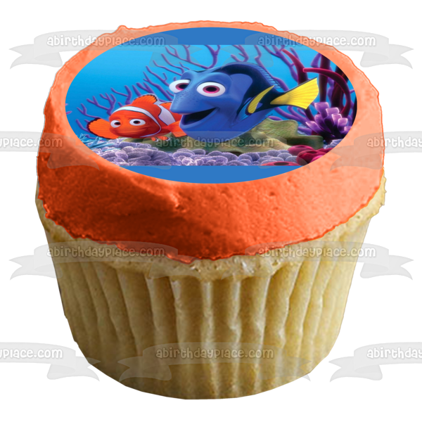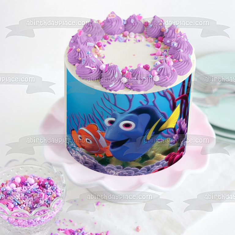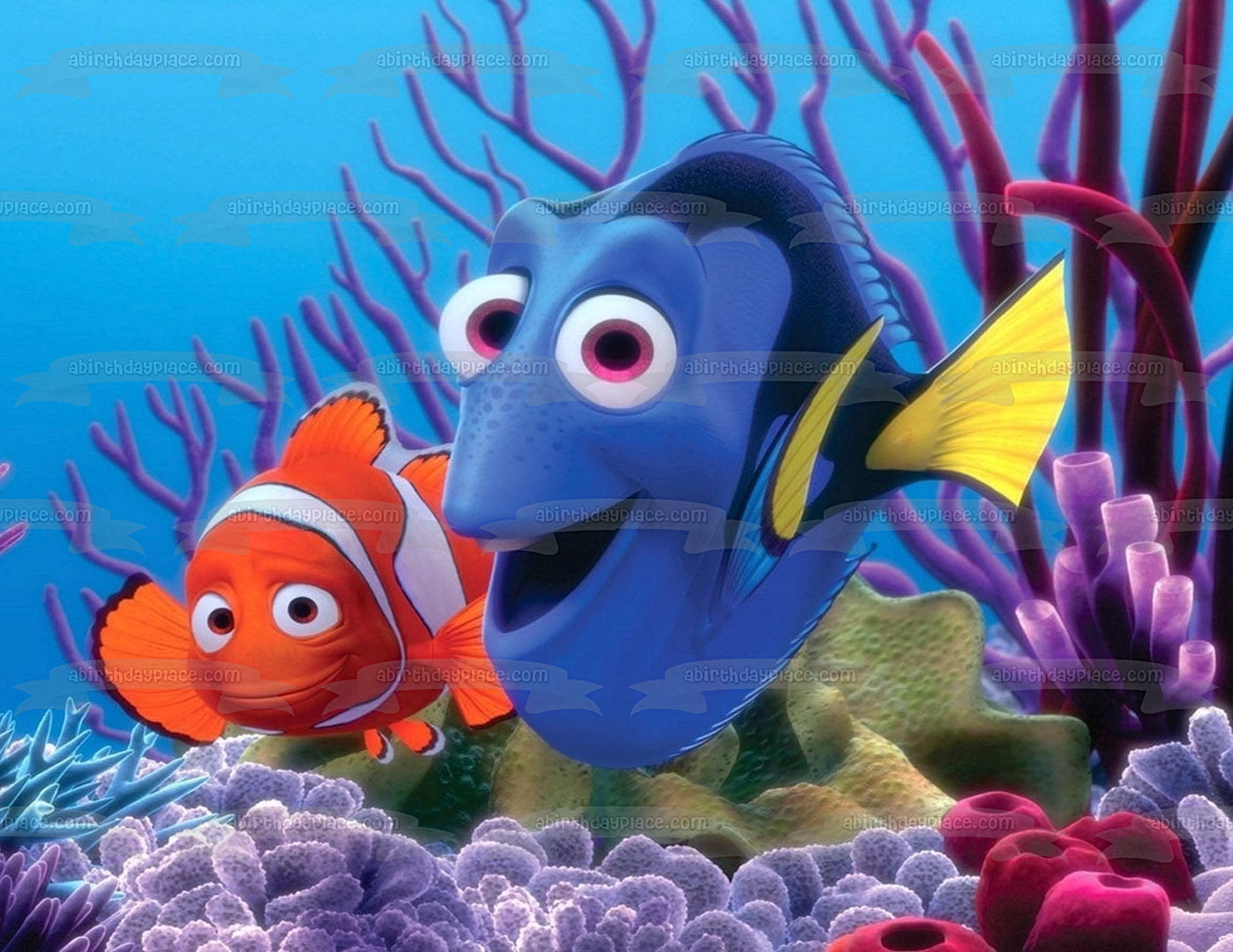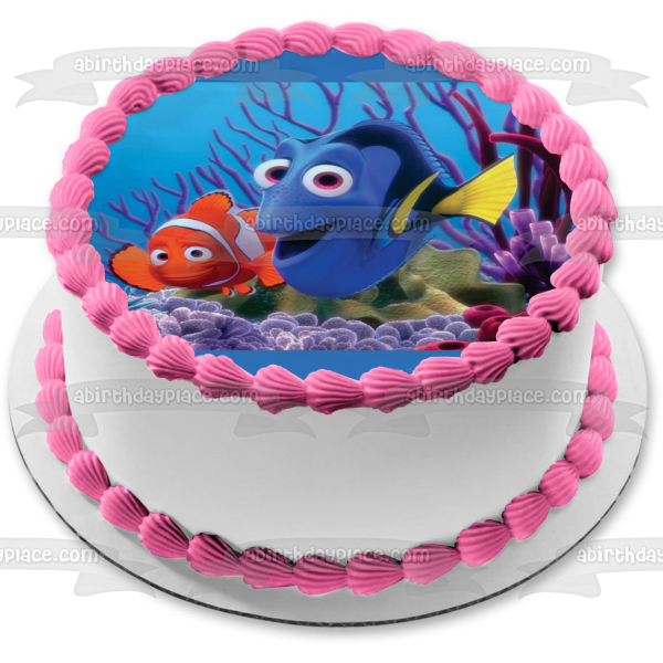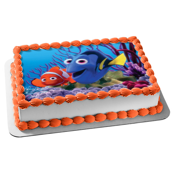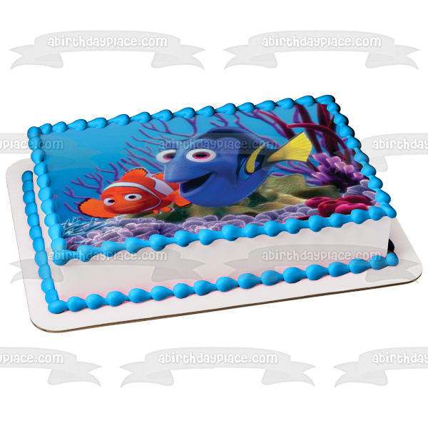 Celebrate your special occasion with this Finding Nemo themed Edible Cake Topper Image featuring Marlin and Dory in the Coral!
