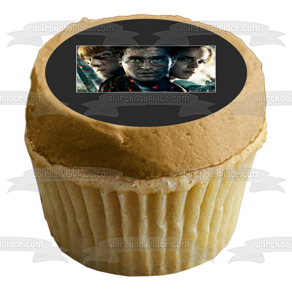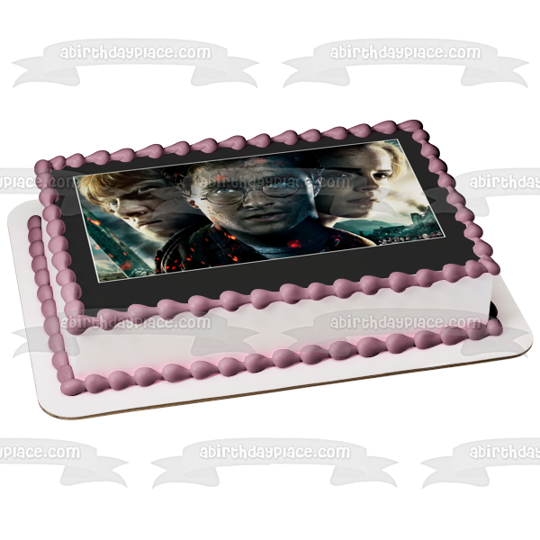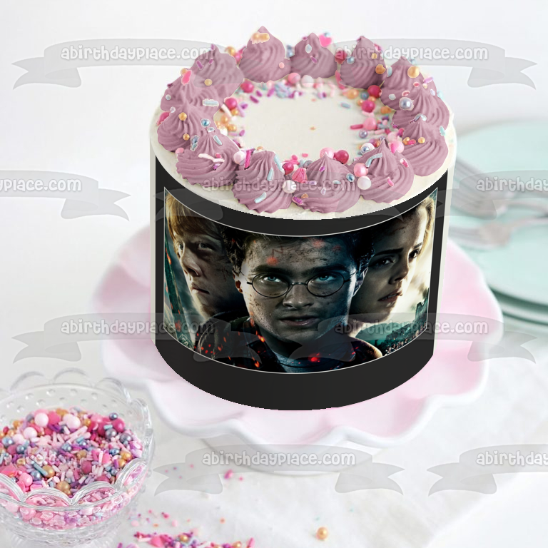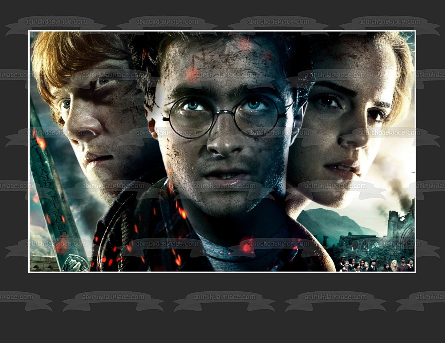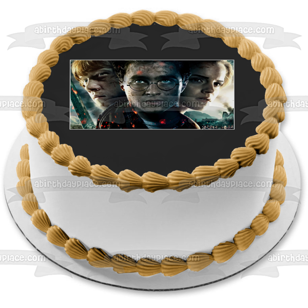 Celebrate your special occasion with this Harry Potter themed Edible Cake Topper Image featuring Harry Potter, Hermione Granger and Ronald Weasley with a Sword!