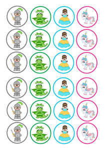 Celebrate your special day with these 24 Hours Fantasy themed Edible Cupcake Topper Images featuring a Princess, Green Dragons, Knights and Unicorns!