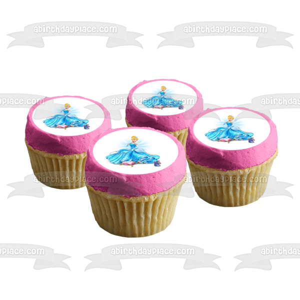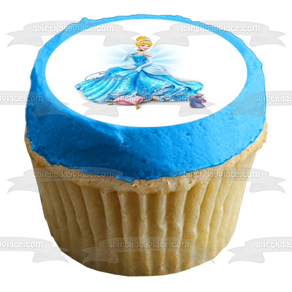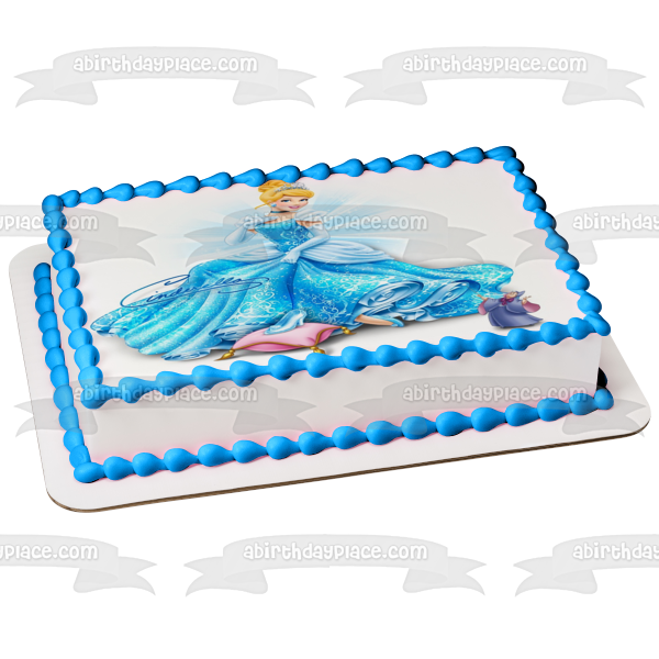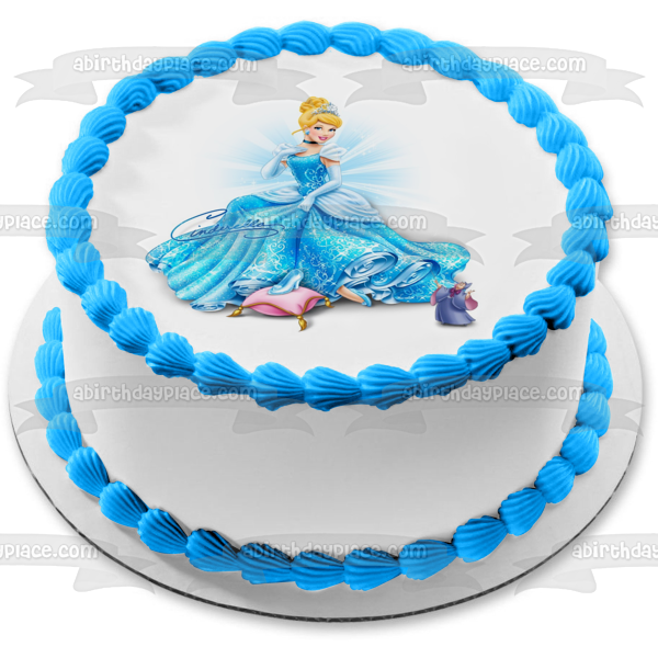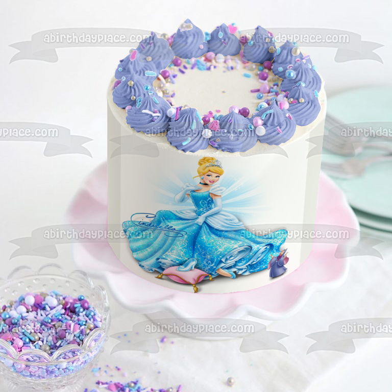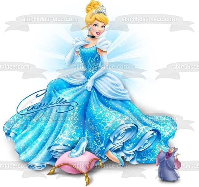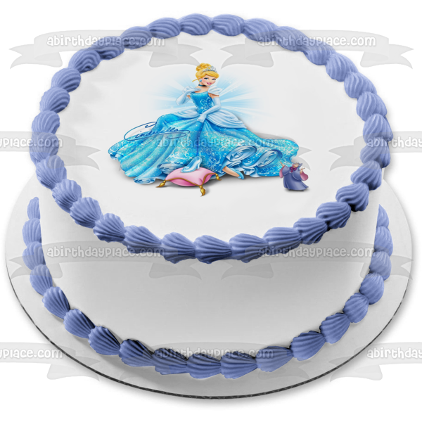 Celebrate your special occasion with this Edible Cake Topper Image featuring Cinderella wearing a Blue Dress behind a Glass Slipper on a Pillow!