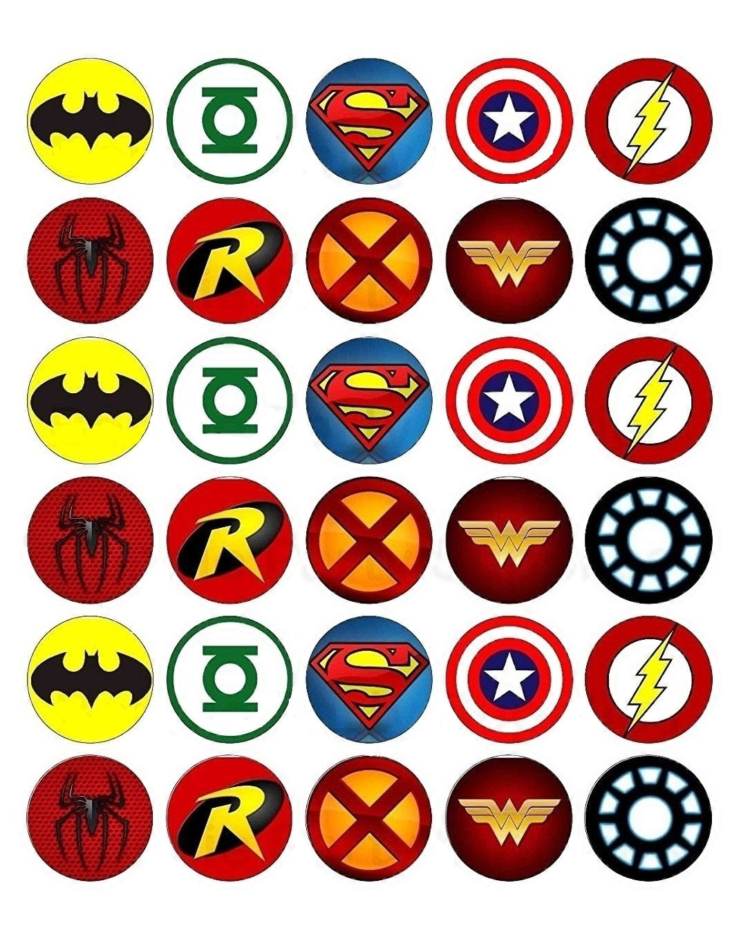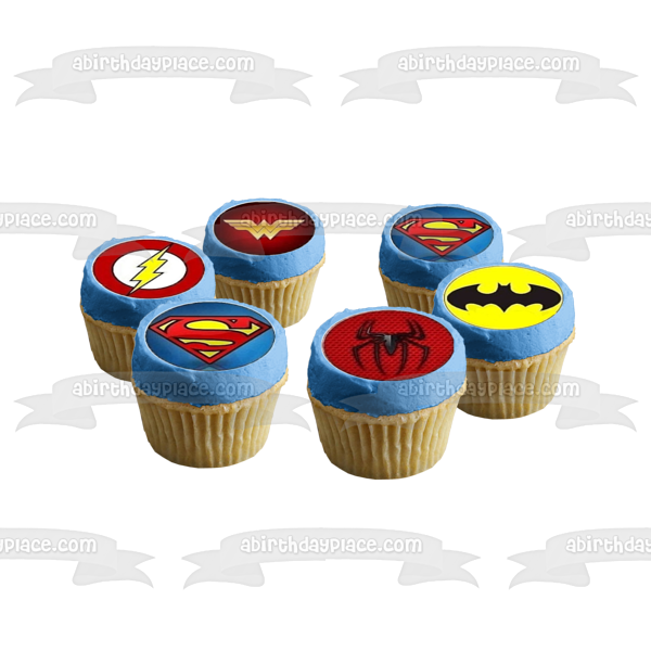 Celebrate your Superhero fan with these 30 Count Superhero Logo themed Edible Cupcake Topper Images featuirng Superman, Captain America, The Flash, Batman, Spider-Man