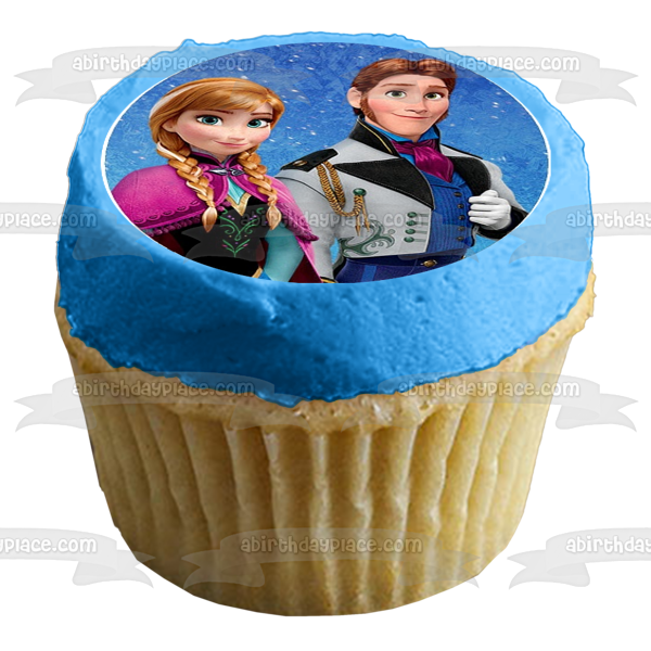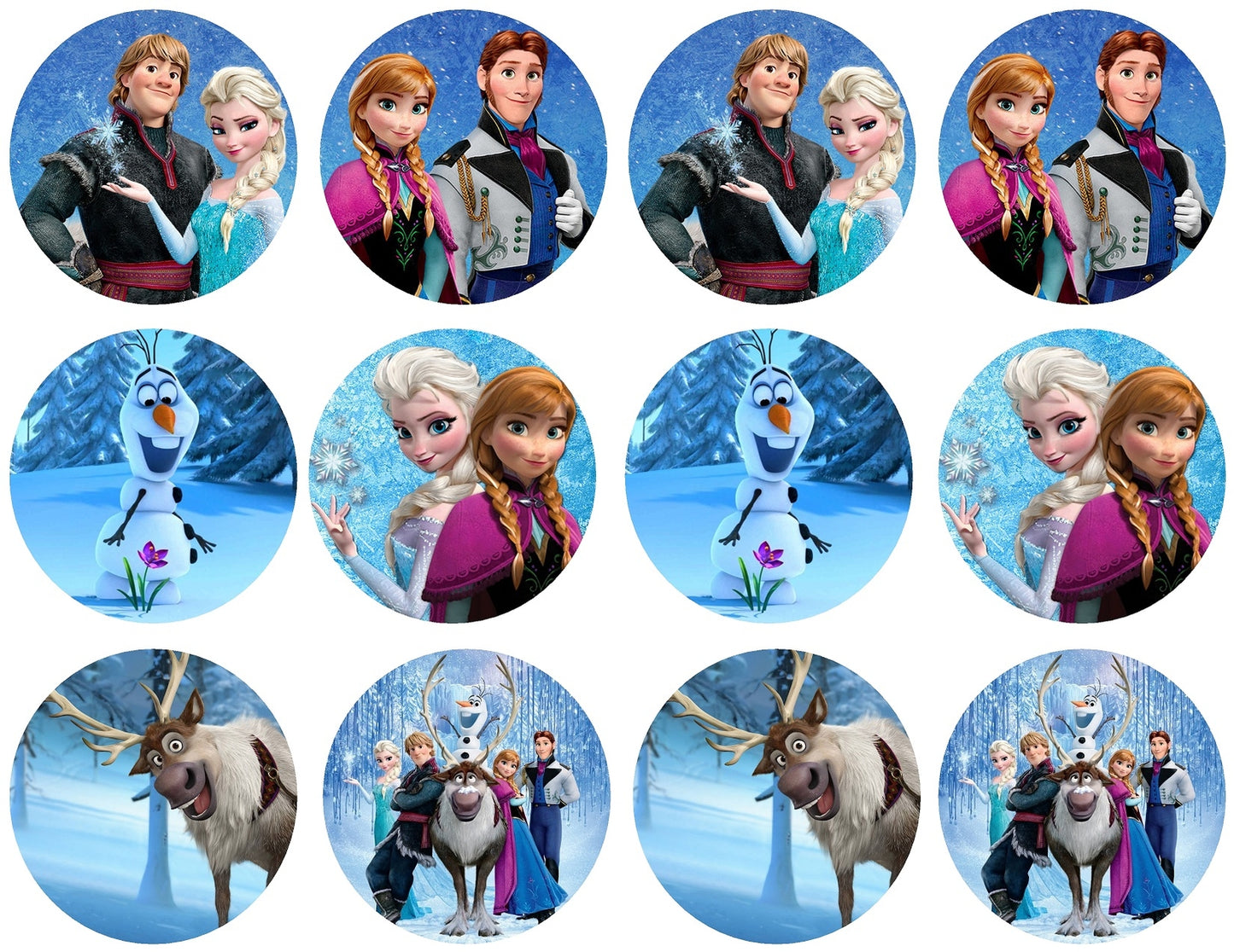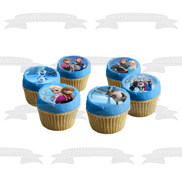 Celebrate your special occasion with these 12 Count Frozen themed Edible Cupcake Topper Images featuring Elsa, Anna, Hans, Olaf and Kristoff!