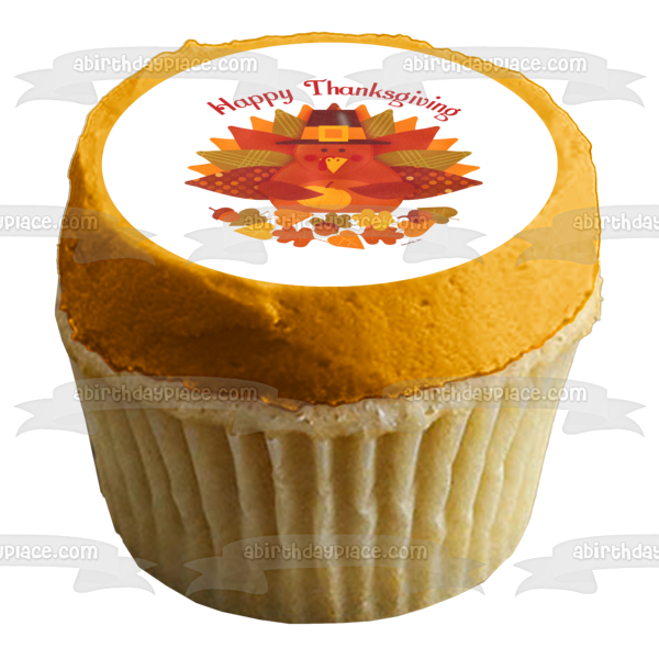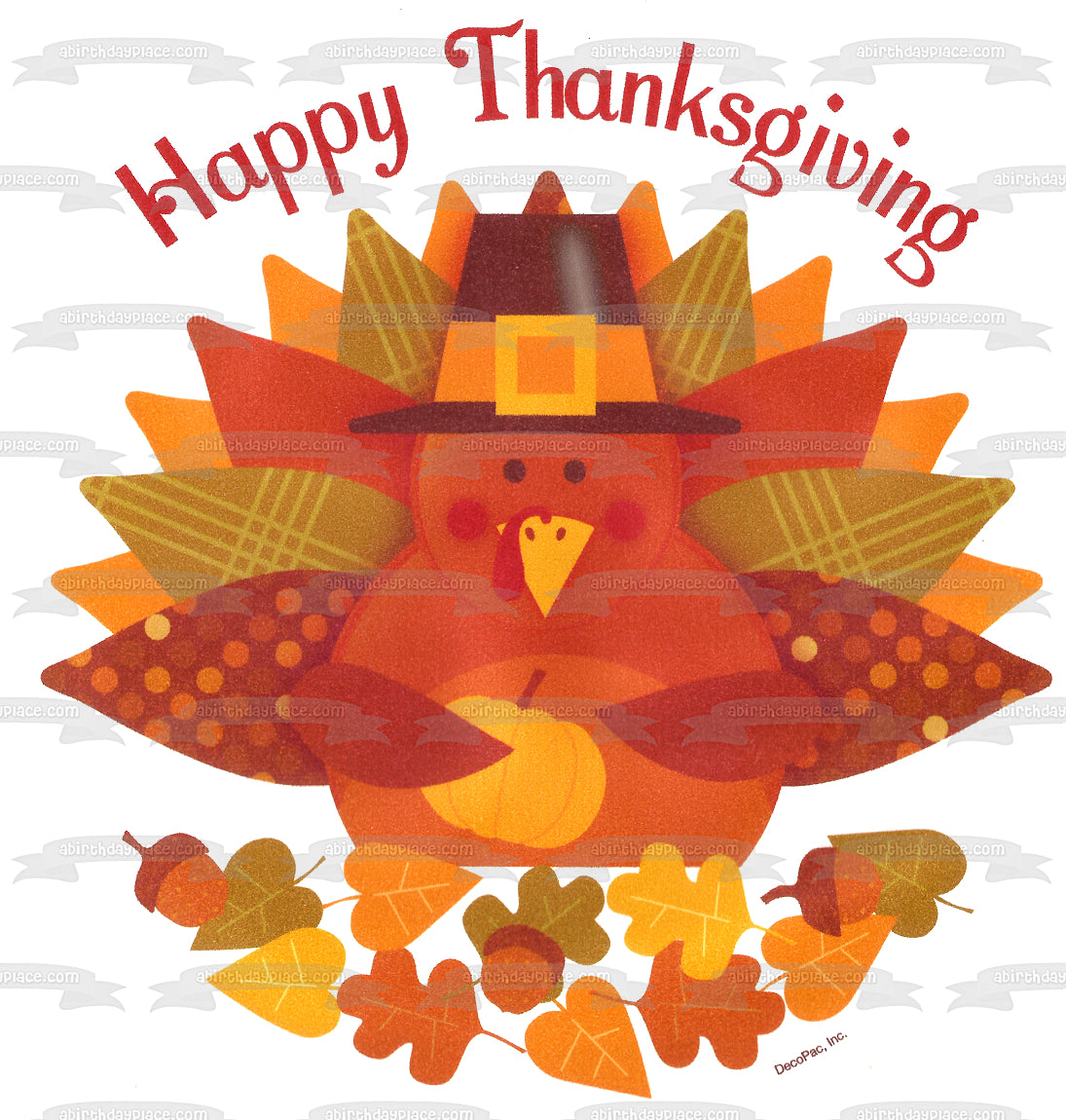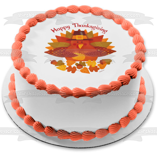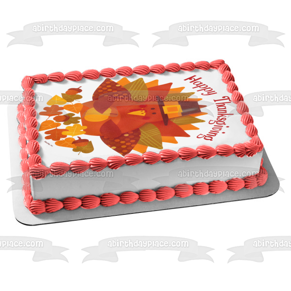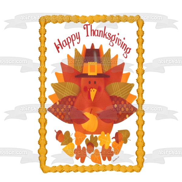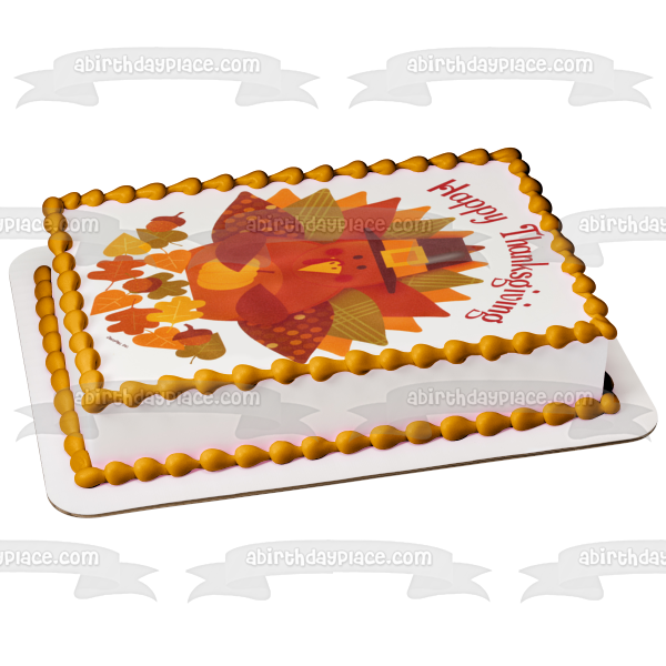 Celebrate your special occasion with this Happy Thanksgiving themed Edible Cake Topper Image featuring a Turkey, Leaves and Acorns!