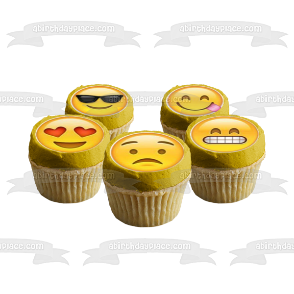 Celebrate your special event with these Emoji Face themed Edible Cupcake Topper Images featuring the Happy Face, Sad Face, In Love Face, Tongue Out Smiley Face and the Sunglasses Smiley Face!