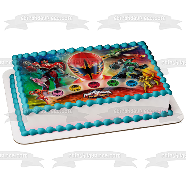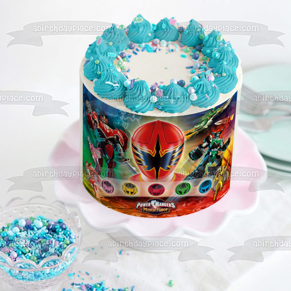 Decorate your cake with this Power Rangers themed Edible Cake Topper Image featuring Red Mystic, Yellow Mystic, Pink Mystic, Blue Mystic, White Mystic, Solaris Knight and Wolf Warrior!