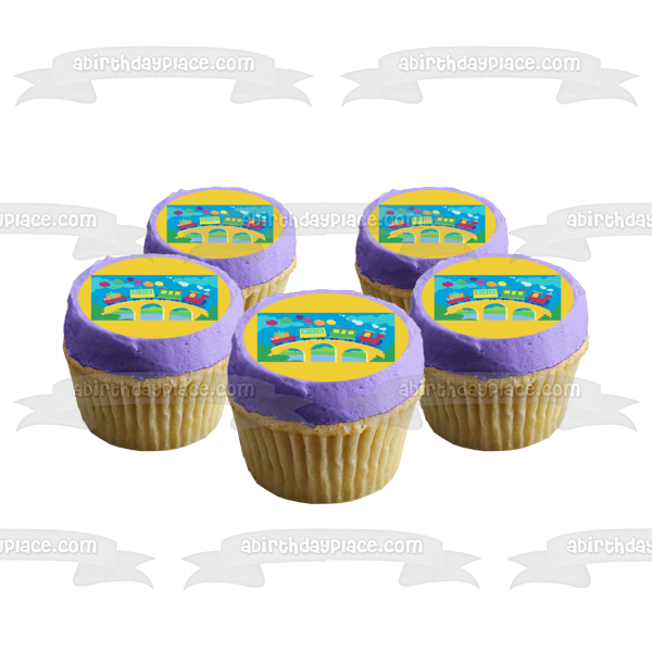 Decorate your cake with this Happy Birthday themed Edible Cake Topper Image featuirng Trains going over a Bridge and Balloons!
