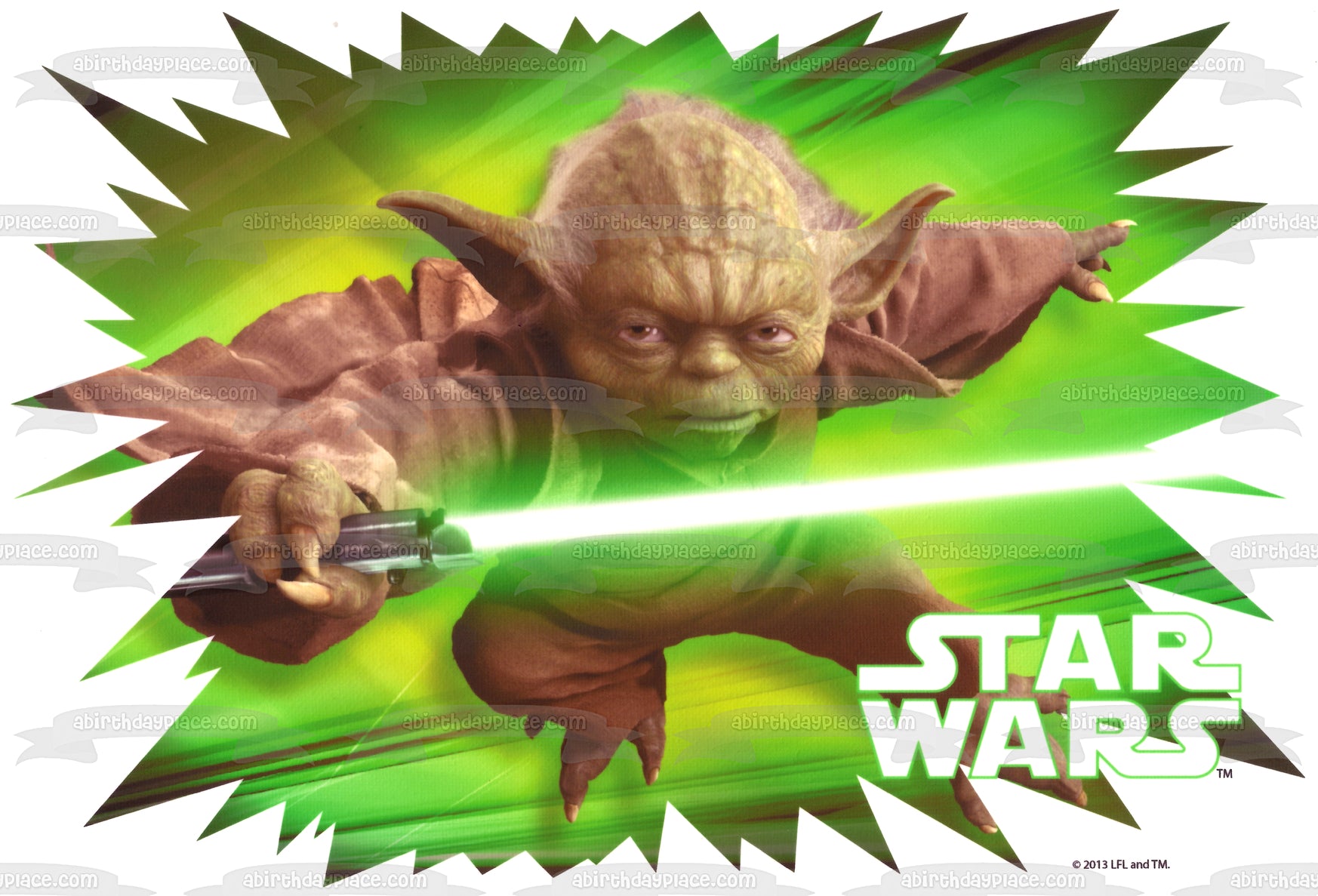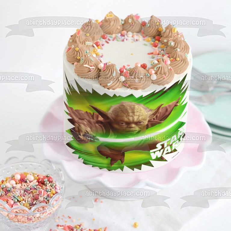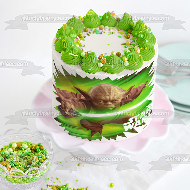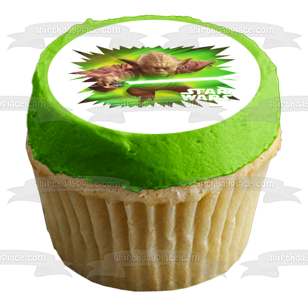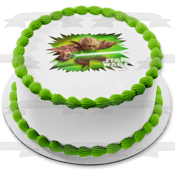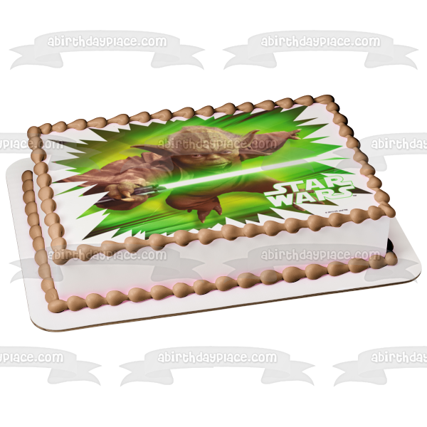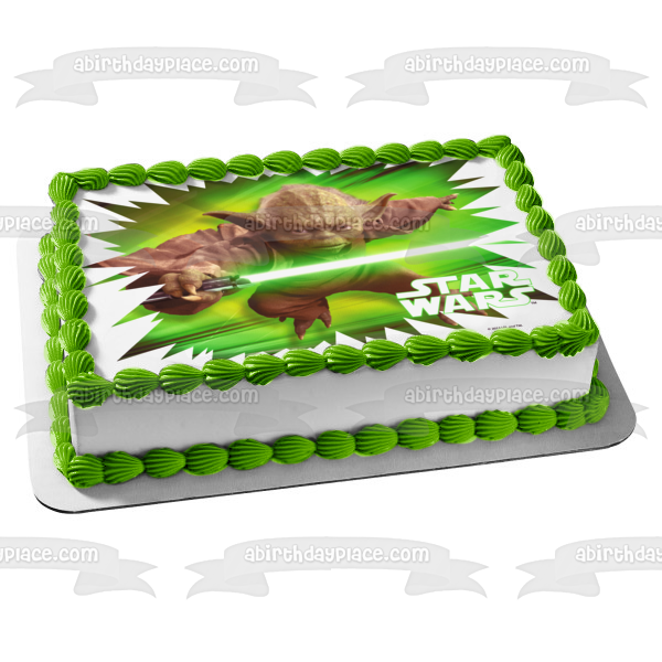 Celebrate your Star Wars fanatic with this Edible Cake Topper Image featuring Yoda holding a Green Lightsaber!
