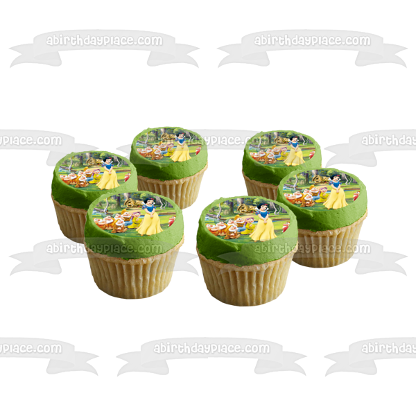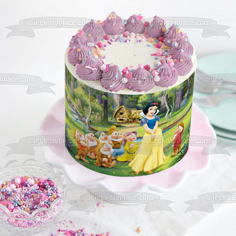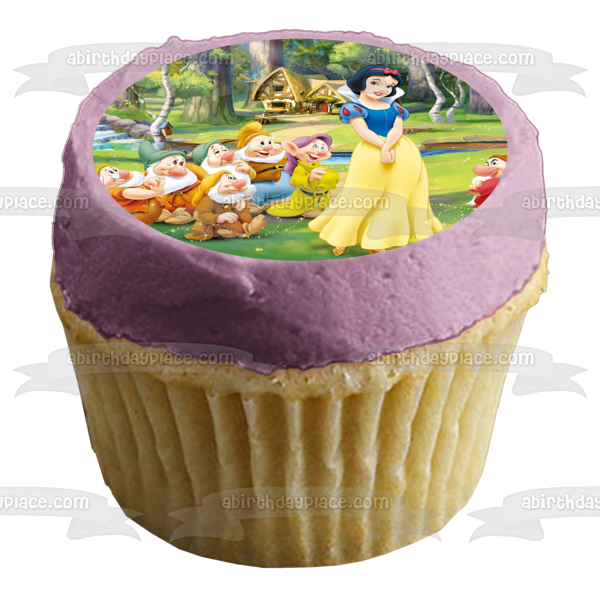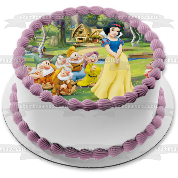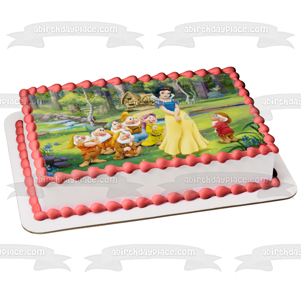 Celebrate your special day with this Snow White themed Edible Cake Topper Image featuring Sneezy, Doc, Bashful, Grumpy, Dopey and Happy!