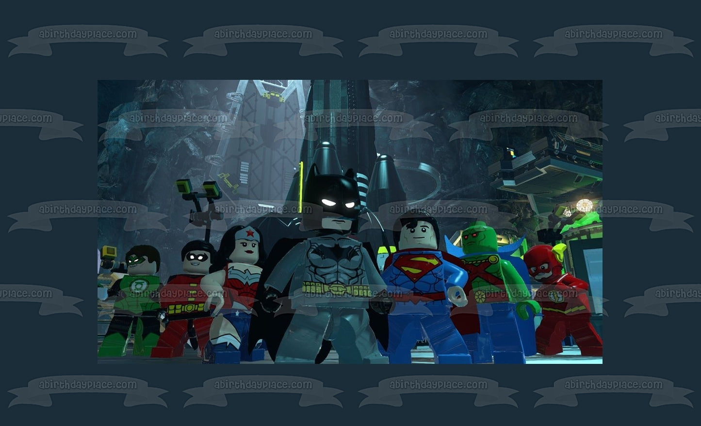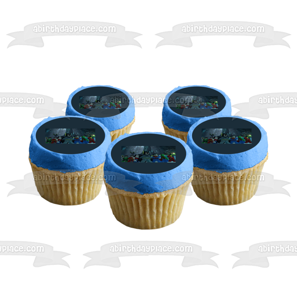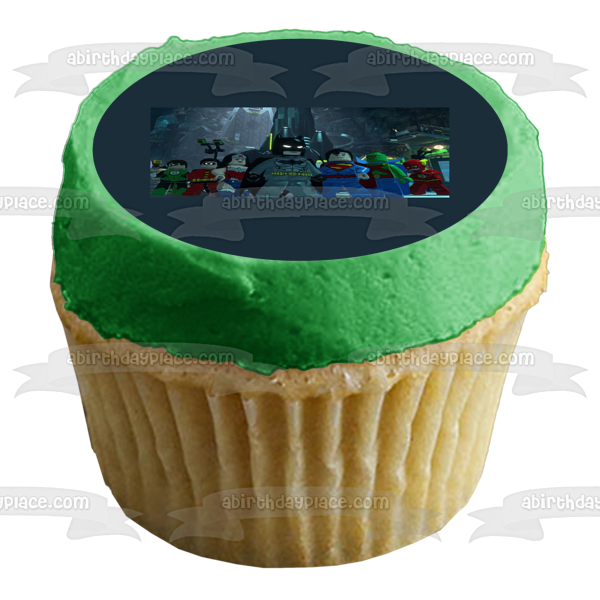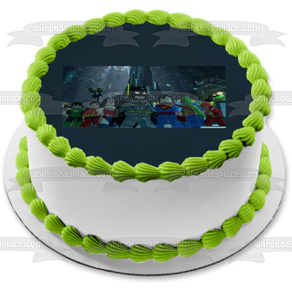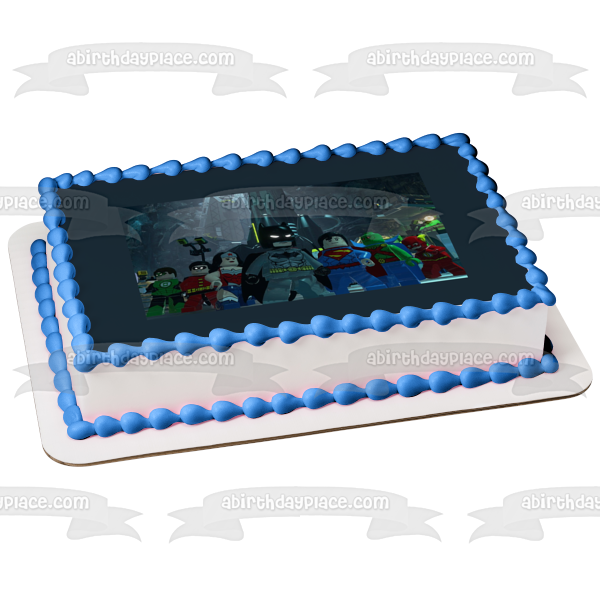 Celebrate your event with this LEGO themed Edible Cake Topper Image featuring LEGO Batman, Robin, Green Lantern, Superman, The Flash and Wonder Woman!