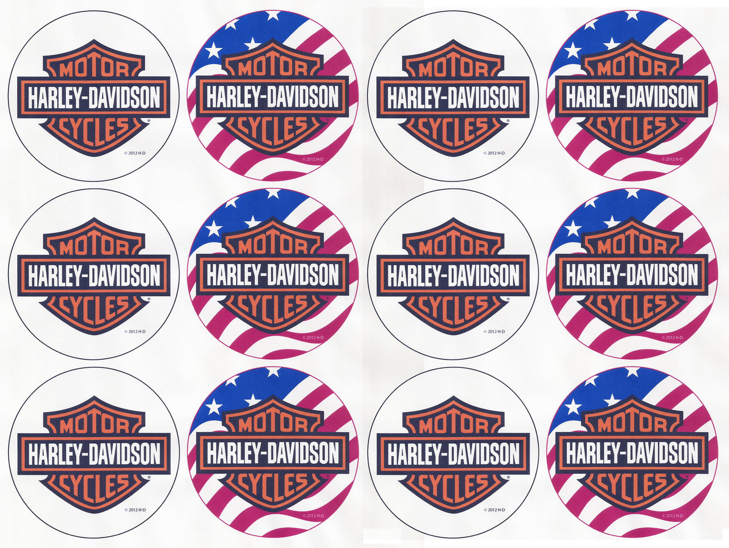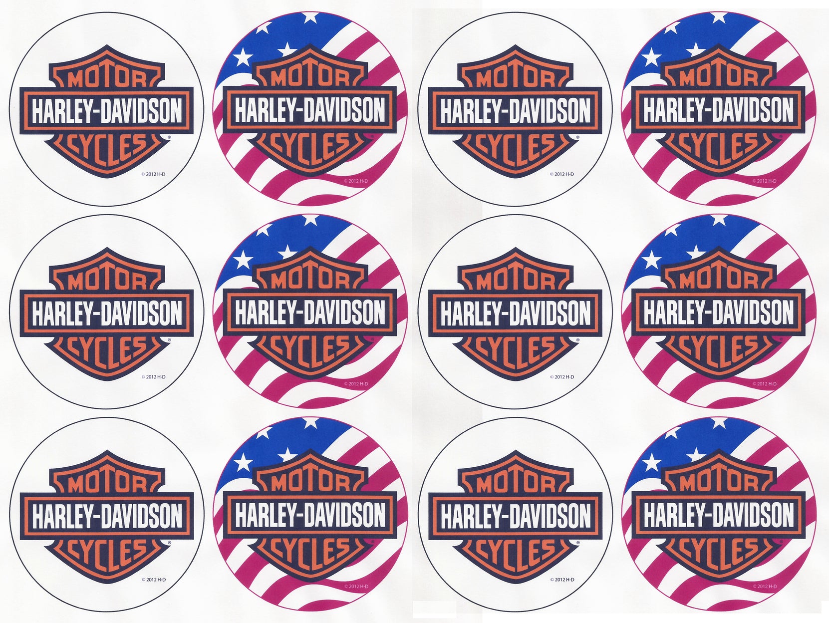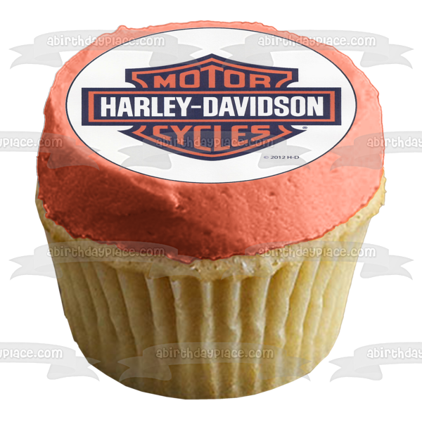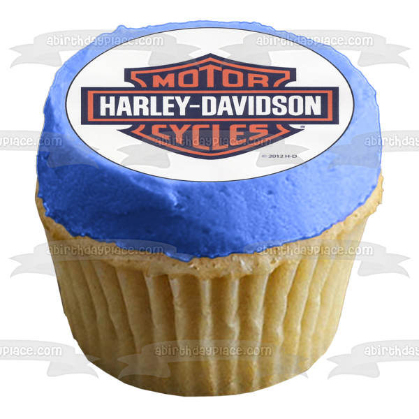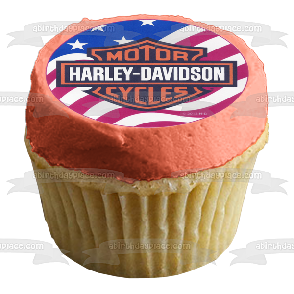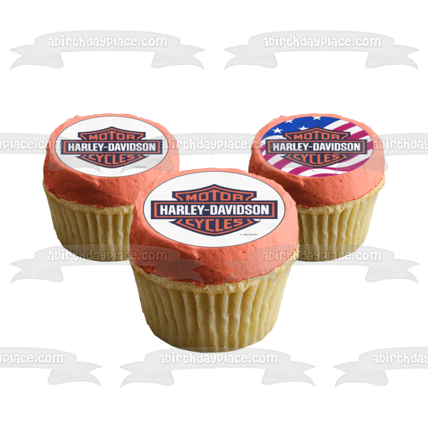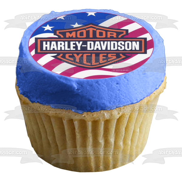 Celebrate your special day with these Harley-Davidson themed Edible Cupcake Topper Image featuring the Harley Davidson motorcycle logo in front of an American flag.