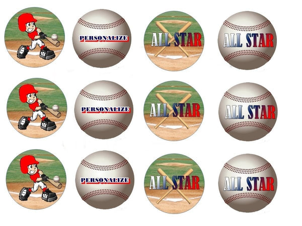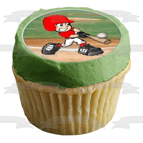 Celebrate your sports fan with these 12 Count Cartoon Baseball themed Edible Cupcake Topper Images featuring Baseballs, Bats and a Boy Hitting a Ball!